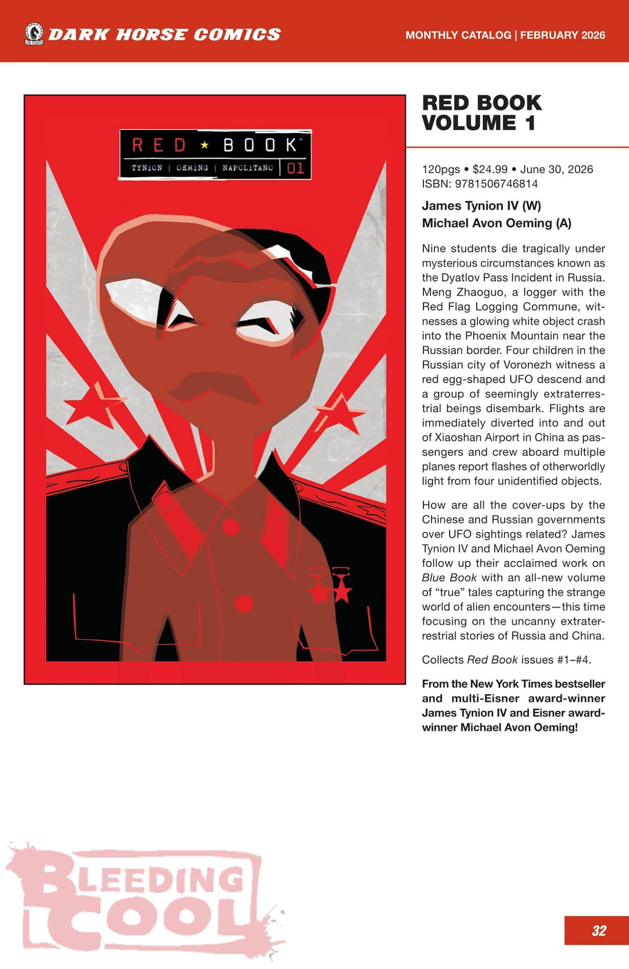 RED BOOK VOLUME 1 Nine students die tragically under mysterious circumstances known as the Dyatlov Pass Incident in Russia. Meng Zhaoguo, a logger with the Red Flag Logging Commune, witnesses a glowing white object crash into the Phoenix Mountain near the Russian border. Four children in the Russian city of Voronezh witness a red egg-shaped UFO descend and a group of seemingly extraterrestrial beings disembark. Flights are immediately diverted into and out of Xiaoshan Airport in China as passengers and crew aboard multiple planes report flashes of otherworldly light from four unidentified objects. How are all the cover-ups by the Chinese and Russian governments over UFO sightings related? James Tynion IV and Michael Avon Oeming follow up their acclaimed work on Blue Book with an all-new volume of "true" tales capturing the strange world of alien encounters—this time focusing on the uncanny extraterrestrial stories of Russia and China. Collects Red Book issues #1–#4.