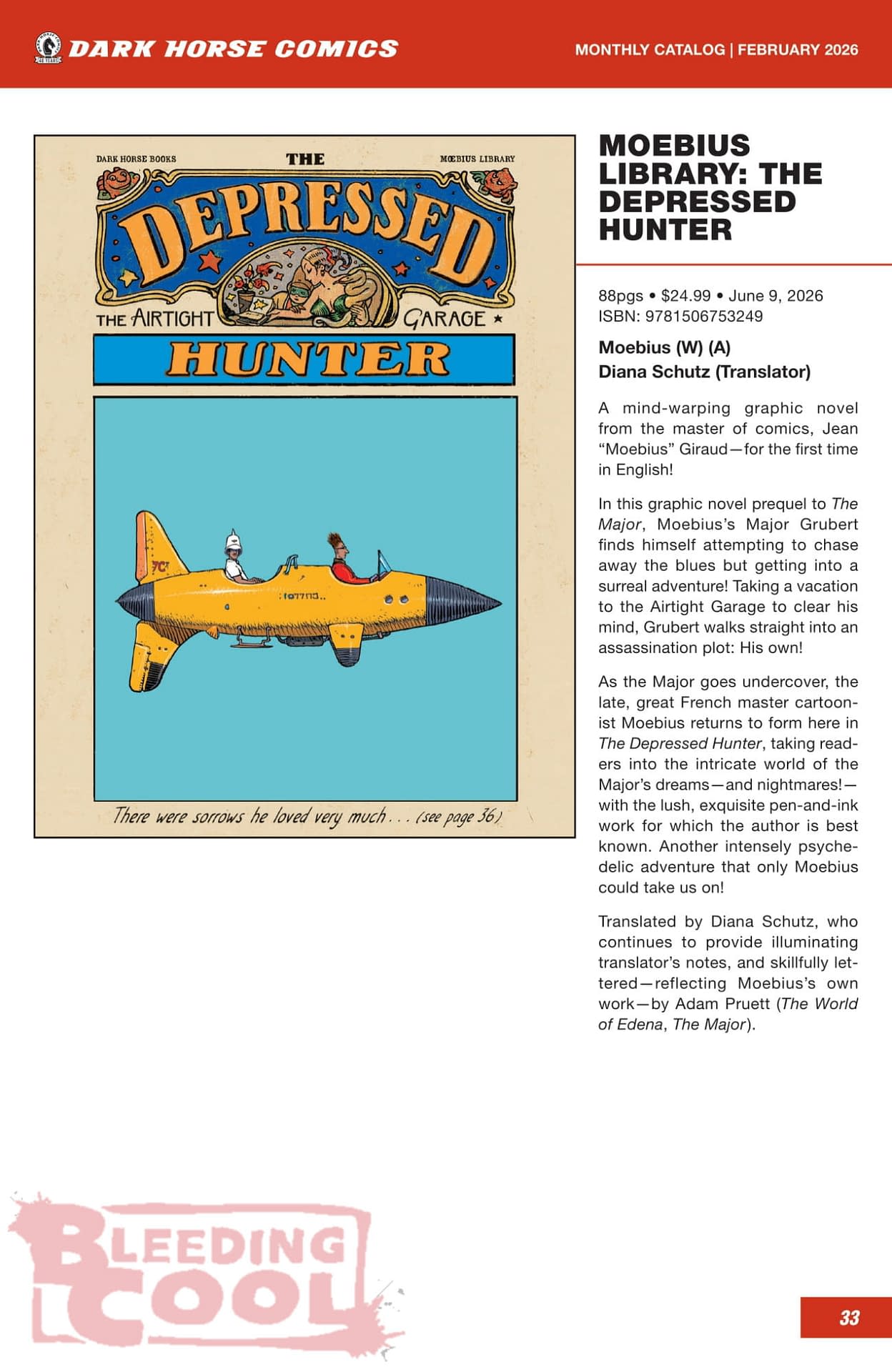 MOEBIUS LIBRARY: THE DEPRESSED HUNTER A mind-warping graphic novel from the master of comics, Jean "Moebius" Giraud—for the first time in English! In this graphic novel prequel to The Major, Moebius's Major Grubert finds himself attempting to chase away the blues but getting into a surreal adventure! Taking a vacation to the Airtight Garage to clear his mind, Grubert walks straight into an assassination plot: His own! As the Major goes undercover, the late, great French master cartoonist Moebius returns to form here in The Depressed Hunter, taking readers into the intricate world of the Major's dreams—and nightmares!—with the lush, exquisite pen-and-ink work for which the author is best known. Another intensely psychedelic adventure that only Moebius could take us on! Translated by Diana Schutz, who continues to provide illuminating translator's notes, and skillfully lettered—reflecting Moebius's own work—by Adam Pruett (The World of Edena, The Major). 88pgs • $24.99 • June 9, 2026