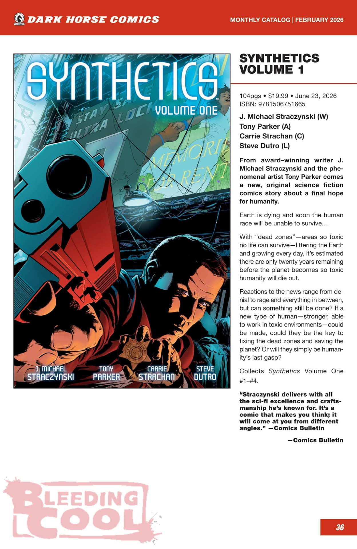 From award–winning writer J. Michael Straczynski and the phenomenal artist Tony Parker comes a new, original science fiction comics story about a final hope for humanity. Earth is dying and soon the human race will be unable to survive… With "dead zones"—areas so toxic no life can survive—littering the Earth and growing every day, it's estimated there are only twenty years remaining before the planet becomes so toxic humanity will die out. Reactions to the news range from denial to rage and everything in between, but can something still be done? If a new type of human—stronger, able to work in toxic environments—could be made, could they be the key to fixing the dead zones and saving the planet? Or will they simply be humanity's last gasp? Collects Synthetics Volume One #1–#4. "Straczynski delivers with all the sci-fi excellence and craftsmanship he's known for. It's a comic that makes you think; it will come at you from different angles." —Comics Bulletin 104pgs • $19.99 • June 23, 2026
