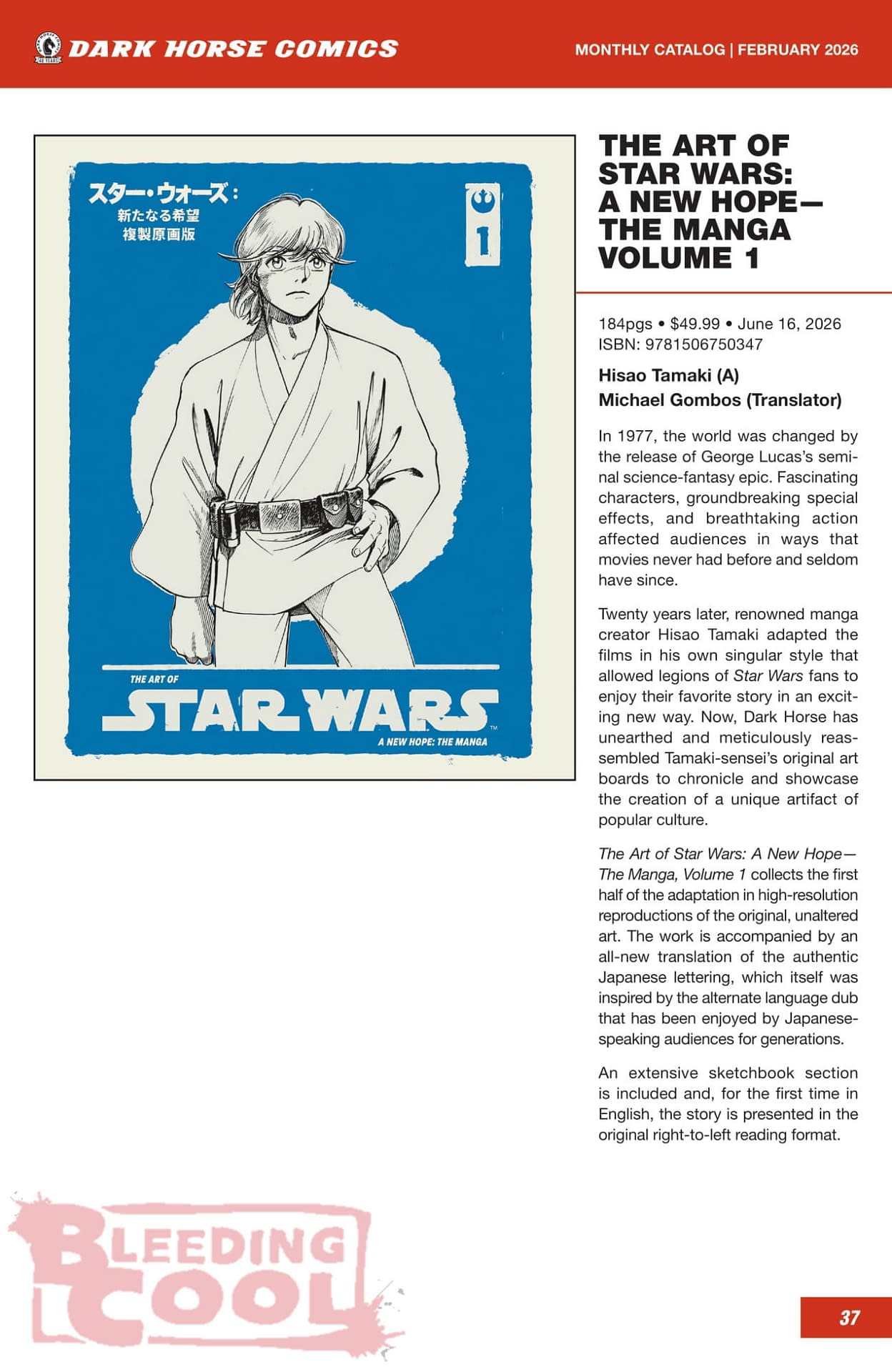 In 1977, the world was changed by the release of George Lucas's seminal science-fantasy epic. Fascinating characters, groundbreaking special effects, and breathtaking action affected audiences in ways that movies never had before and seldom have since. Twenty years later, renowned manga creator Hisao Tamaki adapted the films in his own singular style that allowed legions of Star Wars fans to enjoy their favorite story in an exciting new way. Now, Dark Horse has unearthed and meticulously reassembled Tamaki-sensei's original art boards to chronicle and showcase the creation of a unique artifact of popular culture. The Art of Star Wars: A New Hope—The Manga, Volume 1 collects the first half of the adaptation in high-resolution reproductions of the original, unaltered art. The work is accompanied by an all-new translation of the authentic Japanese lettering, which itself was inspired by the alternate language dub that has been enjoyed by Japanese-speaking audiences for generations. An extensive sketchbook section is included and, for the first time in English, the story is presented in the original right-to-left reading format. 184pgs • $49.99 • June 16, 2026
