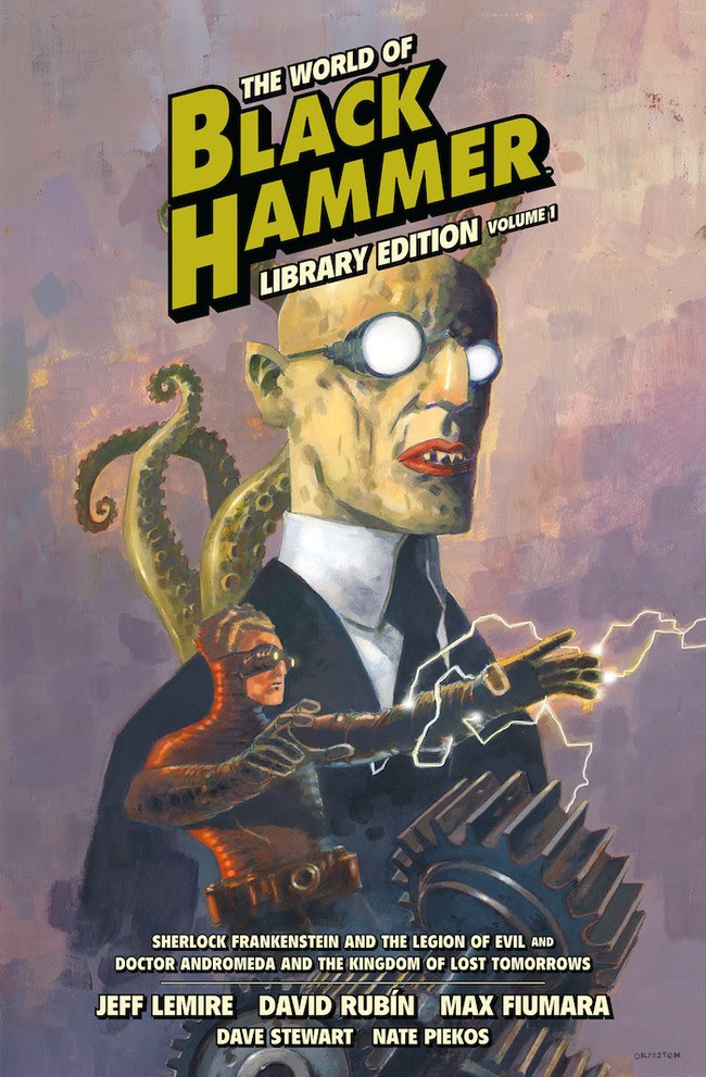 MILWAUKIE, Ore., (January 20, 2020)—Jeff Lemire and Dean Ormston's Eisner Award-winning Black Hammer universe gets a little bit bigger with The World of Black Hammer Library Edition Volume 1. This deluxe, oversized hardcover collects fan-favorite tie-in series Sherlock Frankenstein & the Legion of Evil, illustrated by David Rubín, and Doctor Andromeda and the Kingdom of Lost Tomorrows, illustrated by Max Fiumara, along with a new sketchbook section and more!
