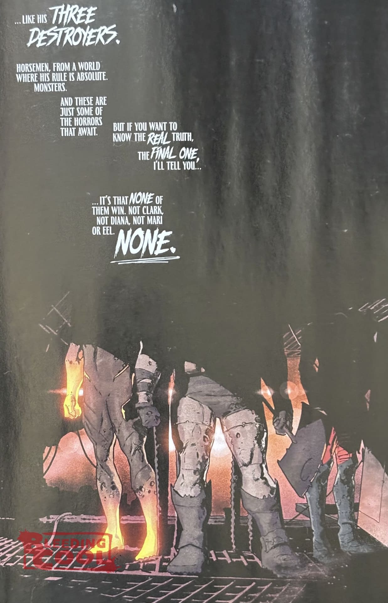 The Three Destroyers are Absolute Superman, Absolute Batman and Absolute Wonder Woman. Or at least their legs and some of their hands. And it looks like they will be fighting the superheroes and villains of the DCU, as part of DC's K.O. somehow. But even after that, there is another. Just like in Squid Game, the big bad is actually fighting among them. Darkseid is masquerading as one of the participants…
