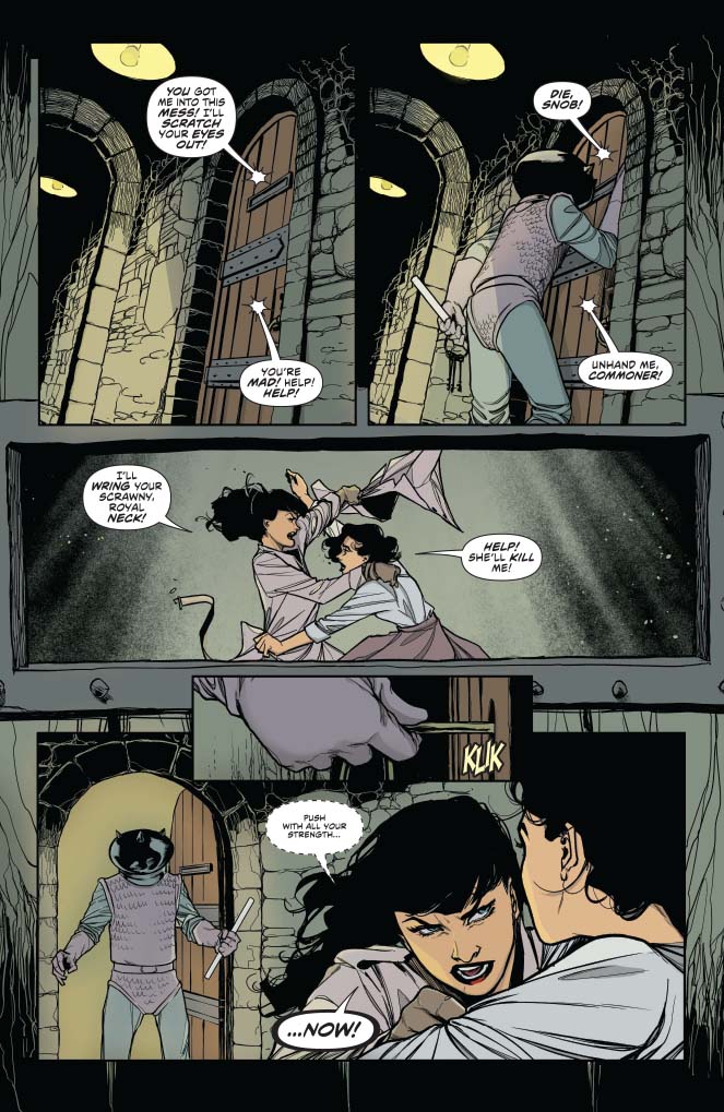 Page 3: Great color work from Ellie Wright throughout, but I particularly like the hazy sunshine cutting through the gloom of the cell here. Queen Elizabeth the 2nd doesn't strike me as a big science fiction fan, so "diving bell" is the closest approximation she has to "space suit." Bettie is more of a consumer of pop culture, and jokingly name checks Professor Moriarty (Sherlock Holmes' archenemy) and "Killer" Kane (a Buck Rogers supervillain.)