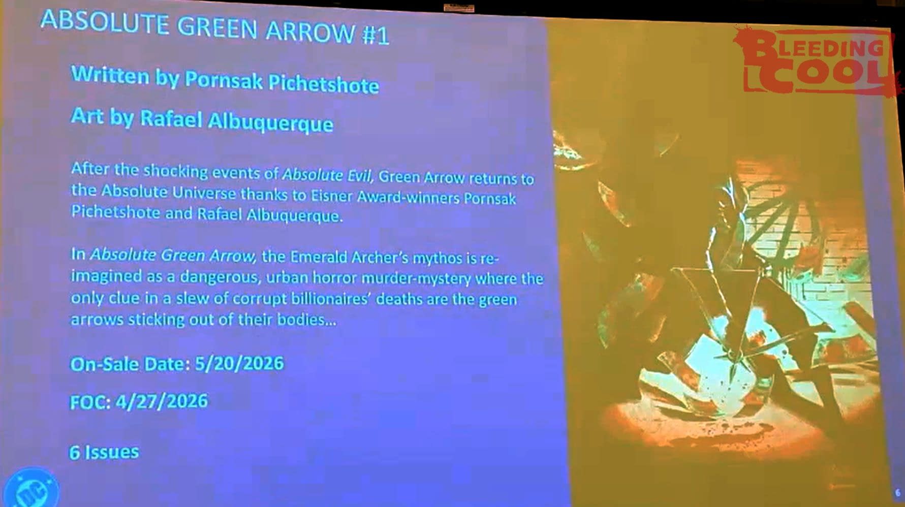 After the shocking events of Absolute Evil, Green Arrow returns to the Absolute Universe thanks to Eisner Award-winners Pornsak Pichetshote and Rafael Albuquerque.In Absolute Green Arrow, the Emerald Archer's mythos is re-imagined as a dangerous, urban horror murder-mystery where the only clue in a slew of corrupt billionaires' deaths are the green arrows sticking out of their bodies…On-Sale Date: 5/20/2026 FOC: 4/27/2026 6 Issues