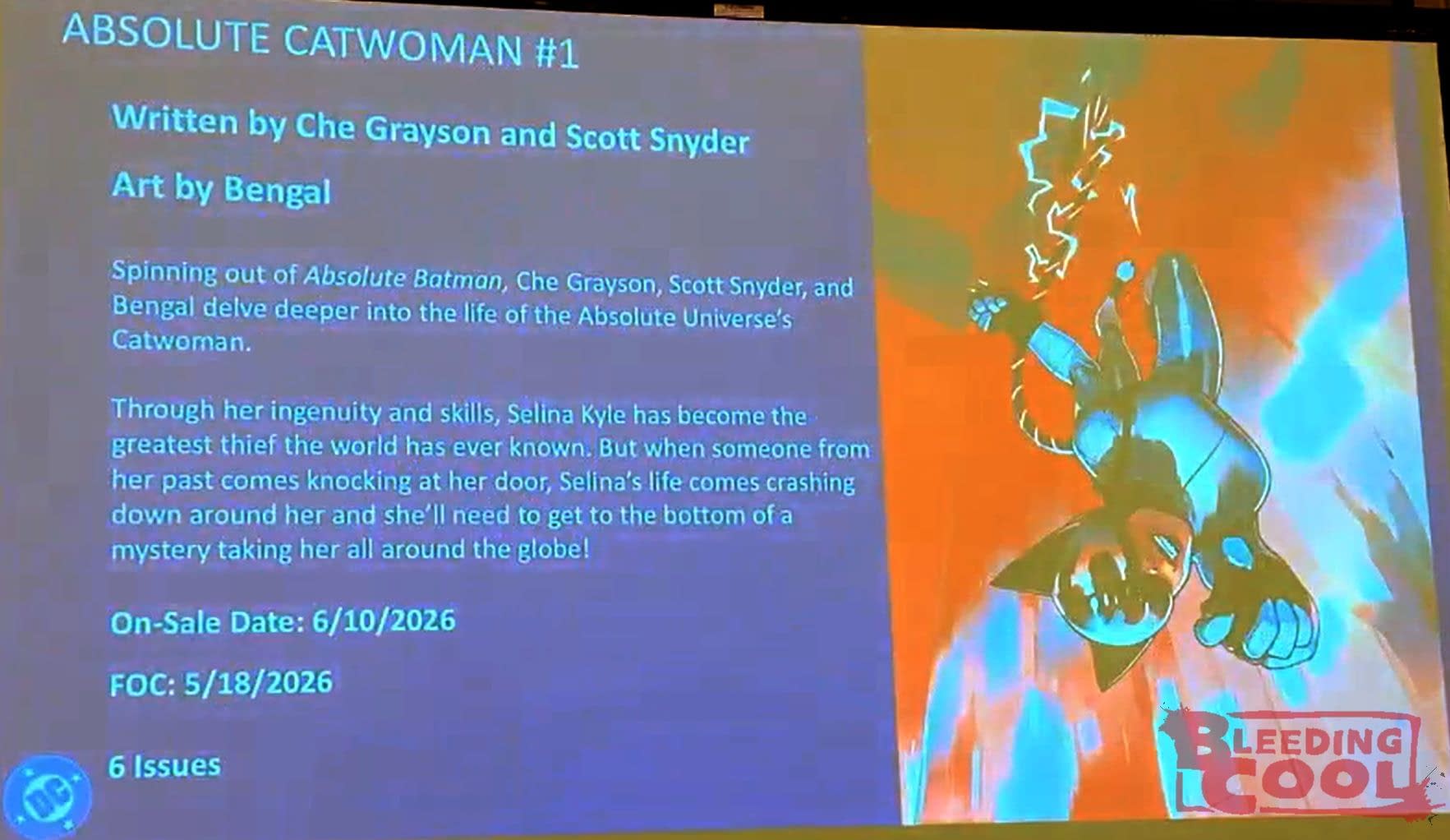 And then Absolute Catwoman, with "Selena Kyle on the run, it teaches you about her missing years in the time after she first left Gotham… you're gonna see the crews she ran with, you're gonna see how she came up, how she made her fortune and you're gonna see all of the people that she pissed off all along the way. This has incredible, incredible art by Bengal, a progressive motion spread, and just packed with character, packed with surprise Absolute Universe reveals."