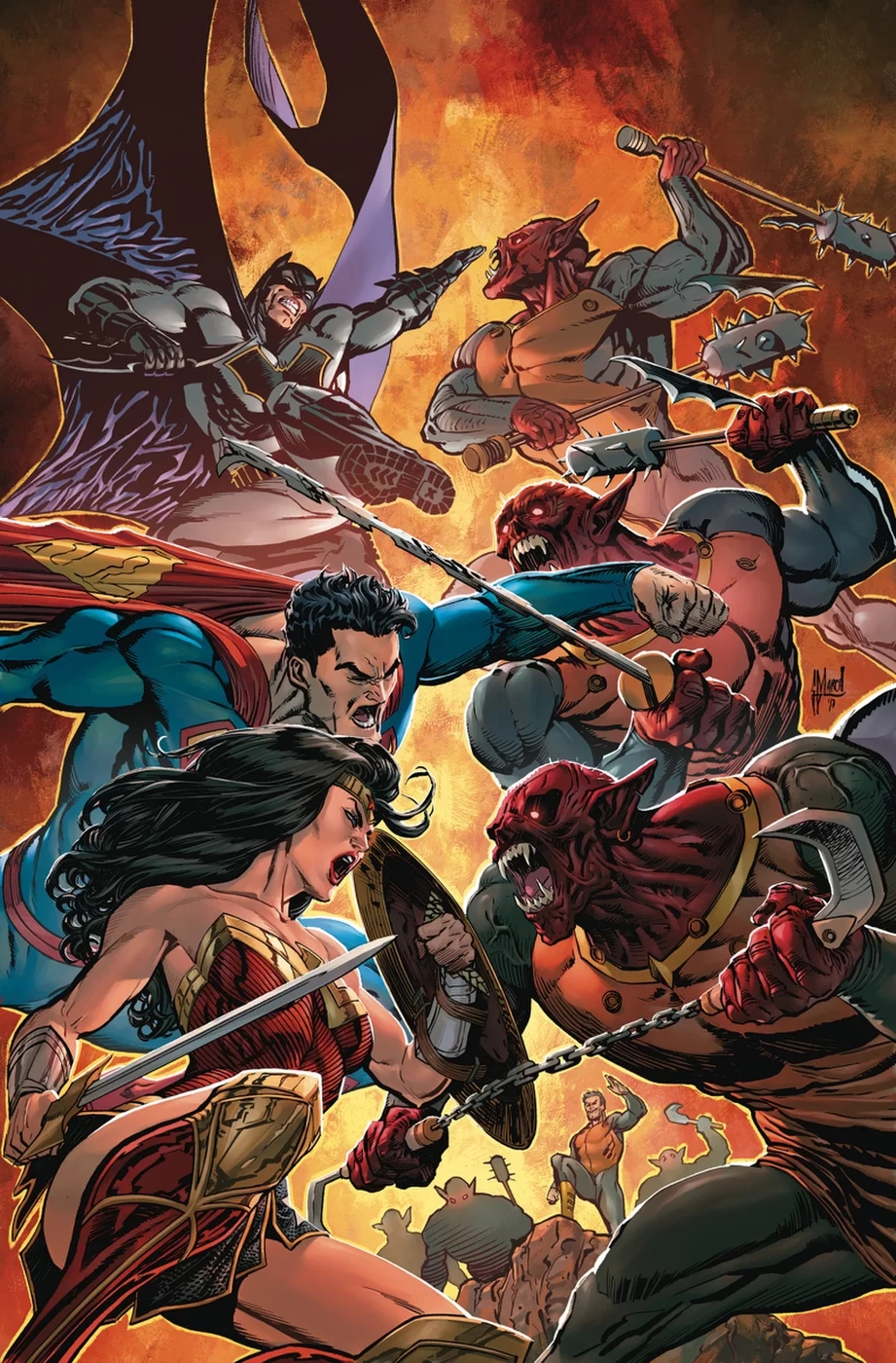 "MAN DOWN" finale! The Trinity and Warlord have discovered Deimos' plan to use the Skartaran Time Weapon to reduce his enemies to dust—but time itself is not on our heroes' side! It's up to Superman, Wonder Woman and Batman to save Steve Trevor, defeat Deimos and seal the breach with Skartaris before the entire world is consumed by magic powerful enough to melt millennia! .