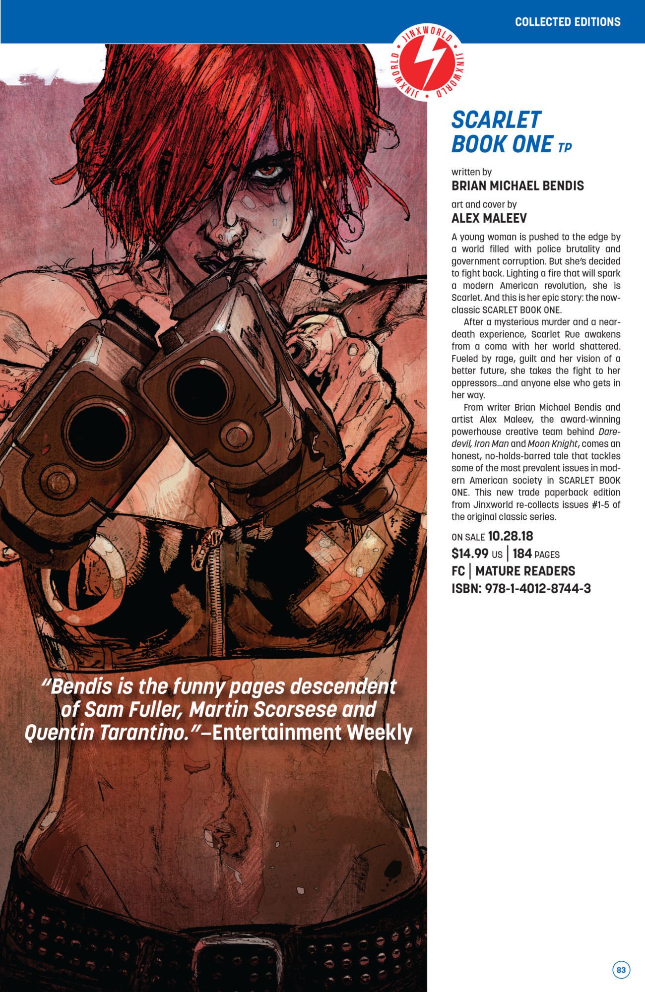 From writer Brian Michael Bendis and artist Alex Maleev, the award-winning powerhouse creative team behind Daredevil, Iron Man and Moon Knight, comes an honest, no-holds-barred tale that tackles some of the most prevalent issues in modern American society in SCARLET BOOK ONE. This new trade paperback edition from Jinxworld re-collects issues #1-5 of the original classic series.