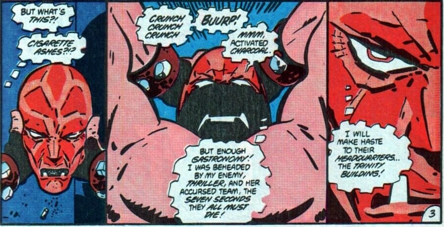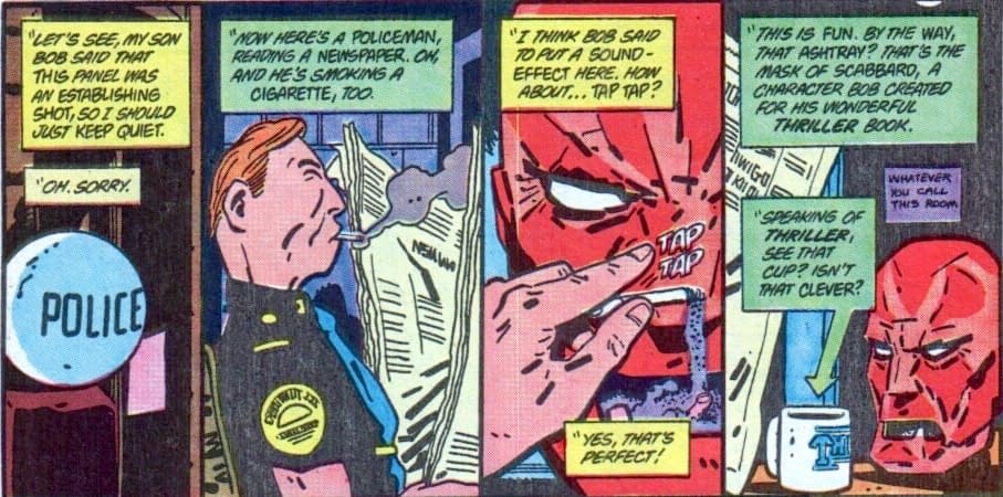 In that issue, Scabbard comically returns from the dead to reclaim his severed head, which a police officer had been using as an ashtray…