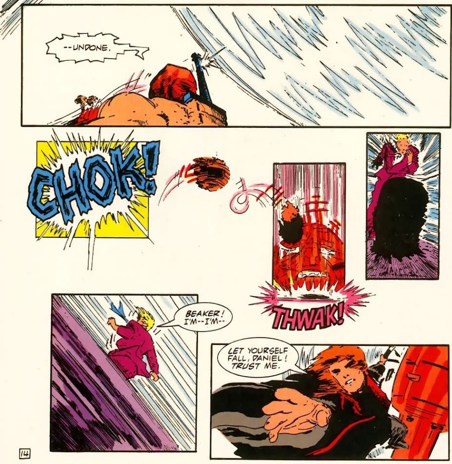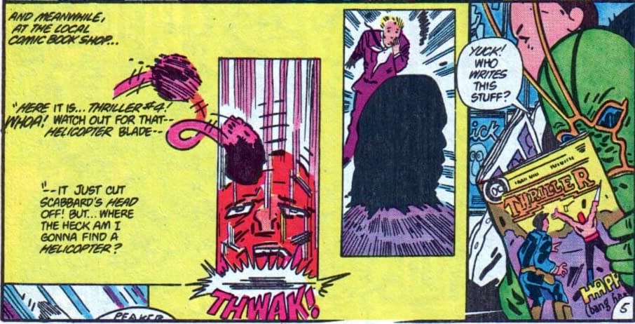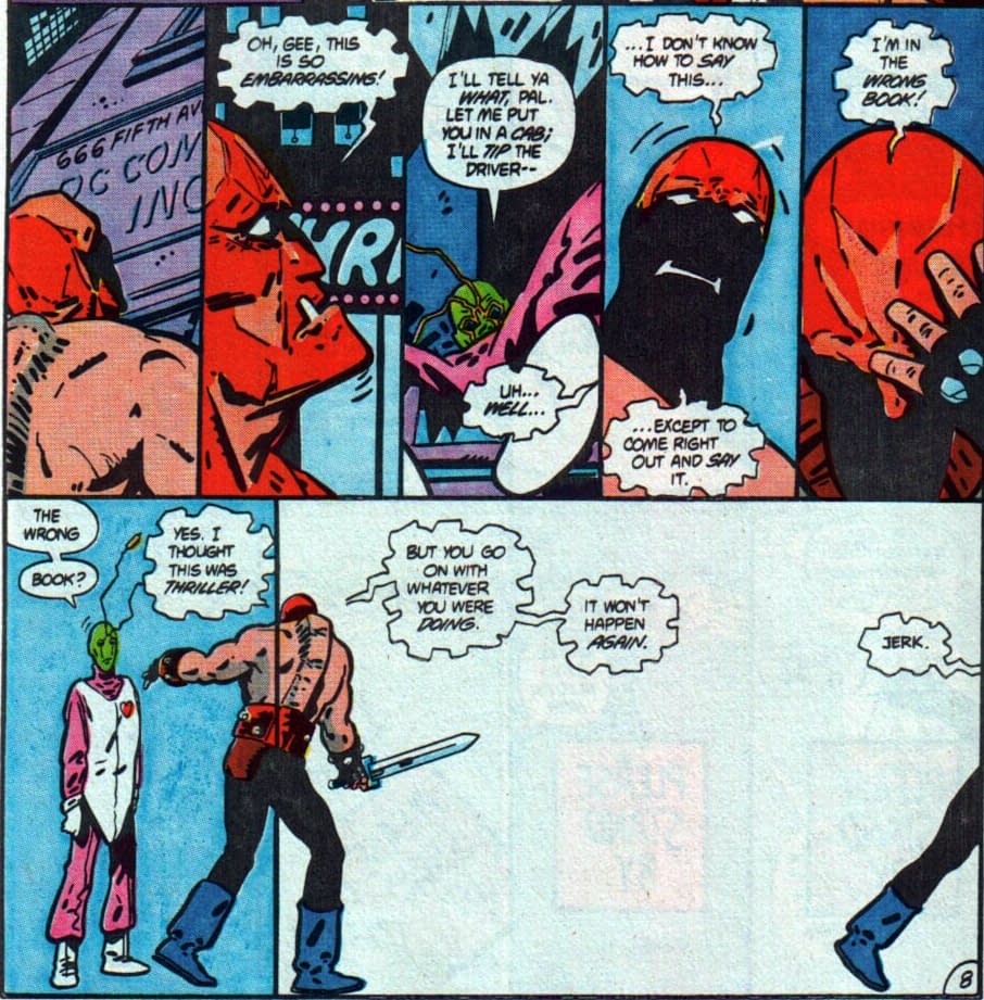… until Scabbard himself realises that he is in the wrong comic, one in which DC Comics actually exists as an entity.