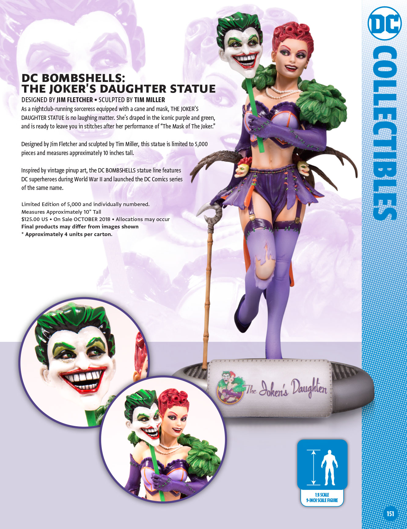 As a nightclub-running sorceress equipped with a cane and mask, THE JOKER'S DAUGHTER STATUE is no laughing matter. She's draped in the iconic purple and green, and is ready to leave you in stitches after her performance of "The Mask of The Joker."