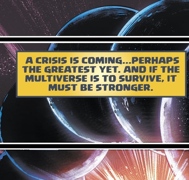 Ever since the sixties, DC Comics has run Crisis storyline that saw parallel universe versions of different characters and teams find common cause to team up, culminating in Crisis On Infinite Earths in the eighties, which would later spin out Zero Hour, Identity Crisis, Infinite Crisis, Final Crisis, Flashpoint, New 52 and Rebirth,