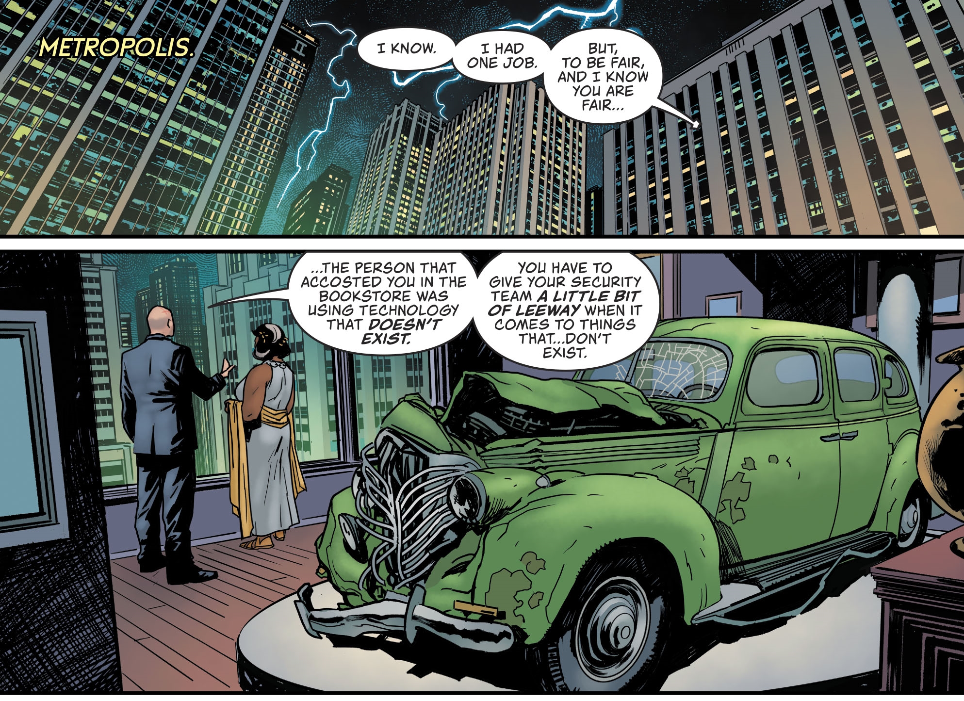 To have one reference in Superman: Return of Kal-El to the green car may look unfortunate, to have two looks like car-lessness. But DC Comics can't let go of the green car. In Action Comics #1000 four years ago, it was revisited by Geoff Johns, Richard Donner and Oliver Coipel in 'The Car'.
