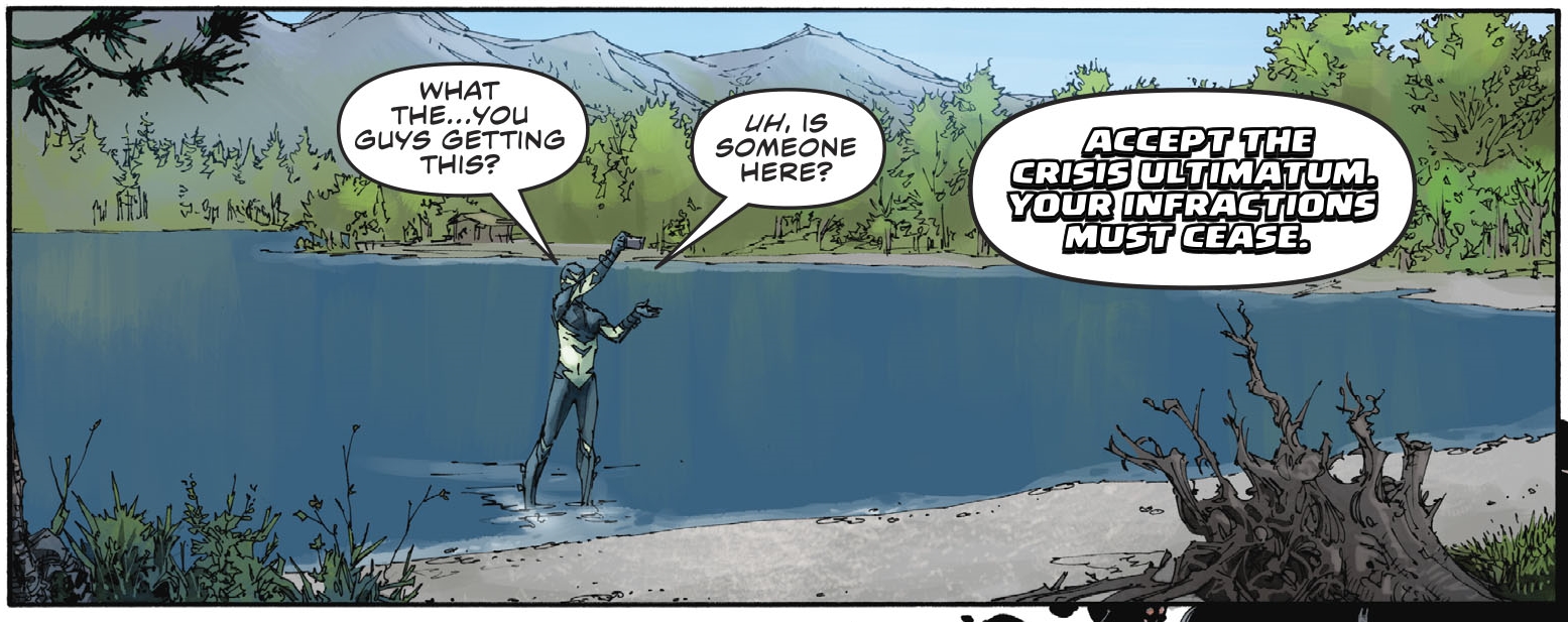 Sideways #1 by Kenneth Rocafort, Justin Jordan, Dan DiDio and Dan Brown sees a young teleporting superhero who likes Red Star action figures, isn't as strong as Superman. His story follows on the mountain that appeared in Gotham in Metal, as he was in the city at the time at an event for a Ms Dominus — any relation to the alien priest? And he now has overprotective parents not letting him out any more, and are worried about school trips. But the mountain gave him his powers to "rift" in space — and maybe time. Hence the Crisis Ultimatum heading his way.