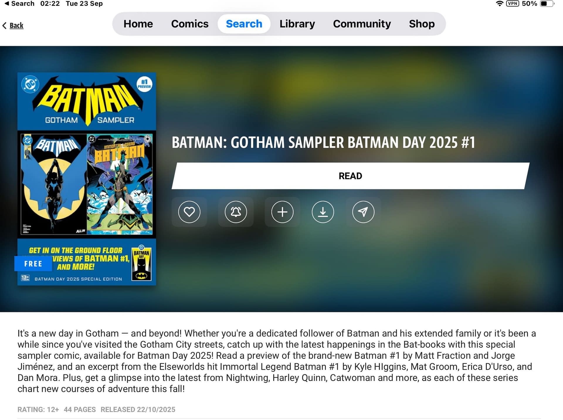 Well, now, too late for Batman Day, the Gotham Sampler is available digitally to those who have access, with less Red Hood and more Immortal Batman. The digital listing with a publication date of 22nd of October, 2025 might suggest that comic book stores will get a replacement version of the Gotham Sampler – or that it's just a typo.