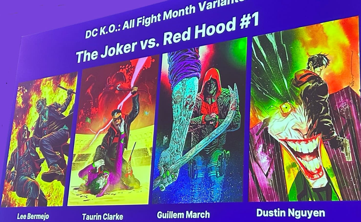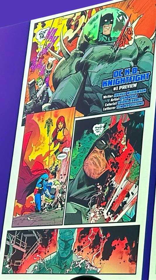 As for DC's K.O. and the list of superheroes and villains being pitched against each other in the Who Will Win tournament. The fights will be down to winning two out of three competitions, and when a character dies, they can respawn as any version of themselves from continuity. Which is how Captain Atom comes back as Monarch, how the Robins are different Batmen in the spinoff Knightfight, and how Red Hood is back looking like Robin, when fighting The Joker, their rematch happens in the warehouse in which The Joker attacked Jason Todd, leading to his death. Josh Williamson admitted that his editors said that this comic book was getting a bit too violent.