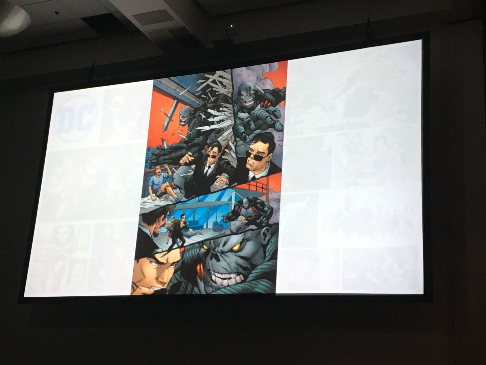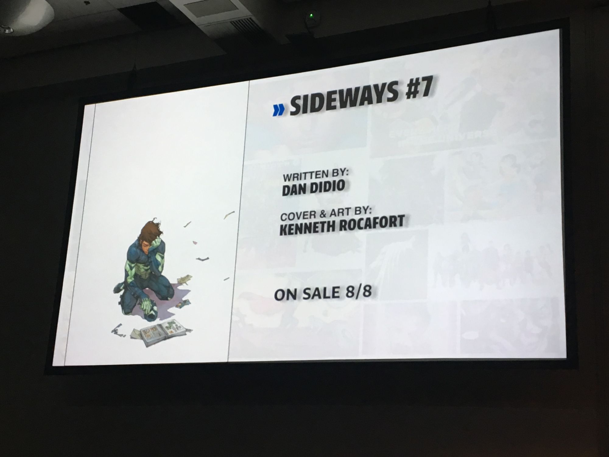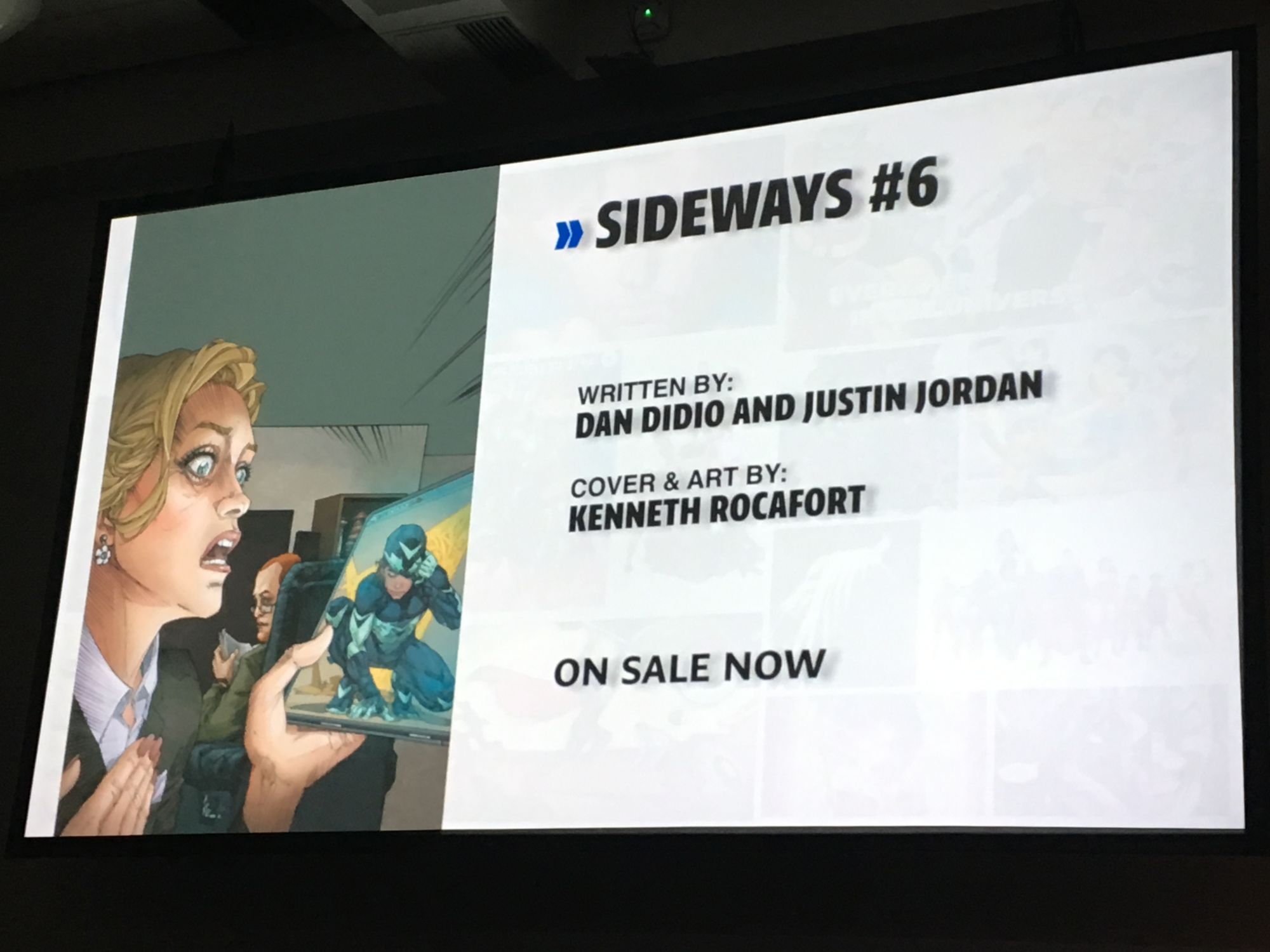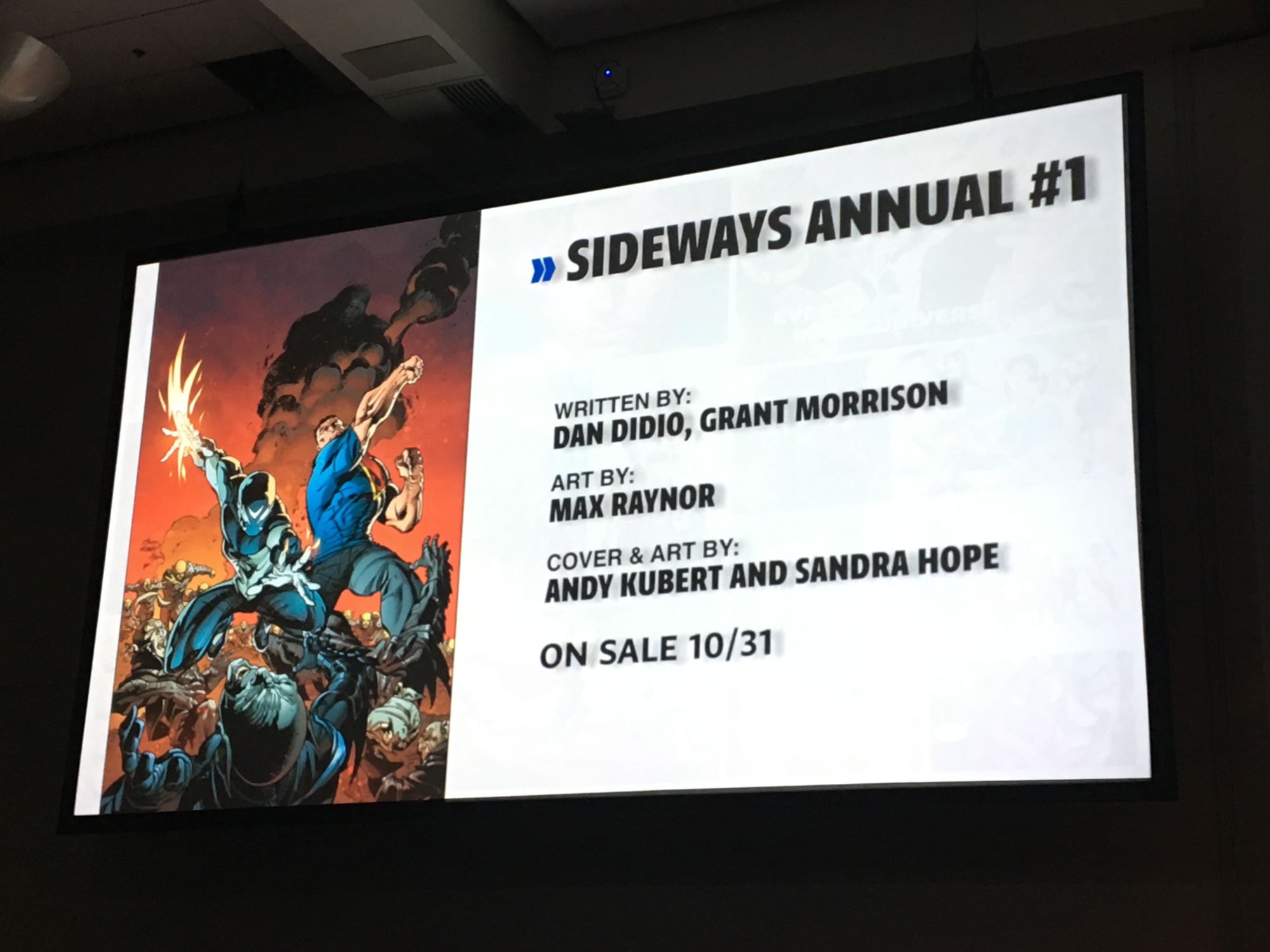 DiDio was late to the panel because he was in Hall H watching the Aquaman movie trailer. "If there was ever a time I wanted to have Sideways' power it was then!" He asked that no one watch the trailer now during this panel but that they should "go to a Marvel panel and watch DC stuff there. No, I'm just kidding… don't go to a Marvel panel."