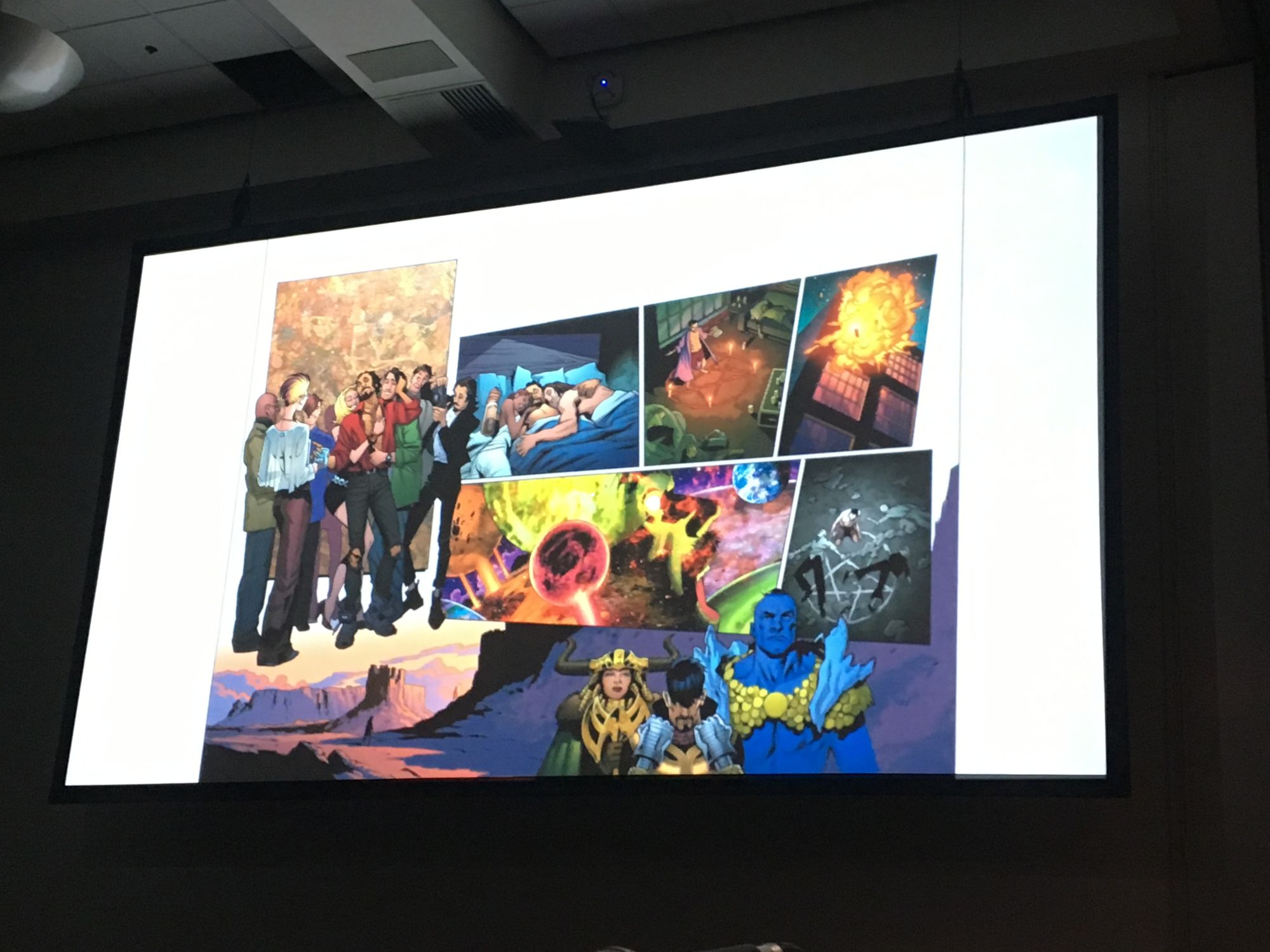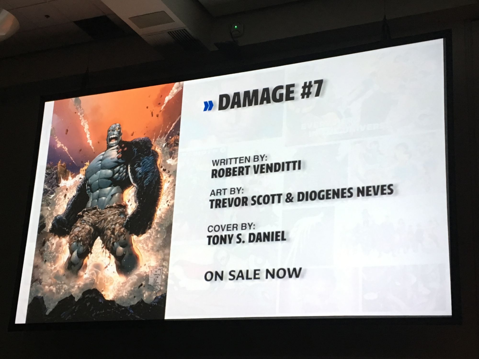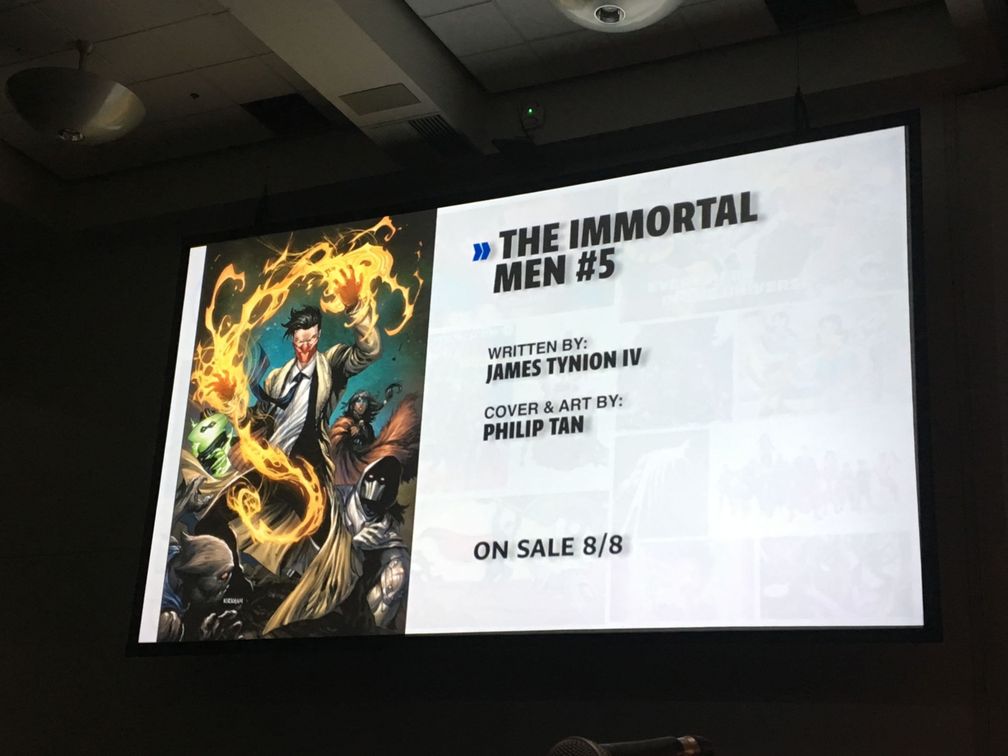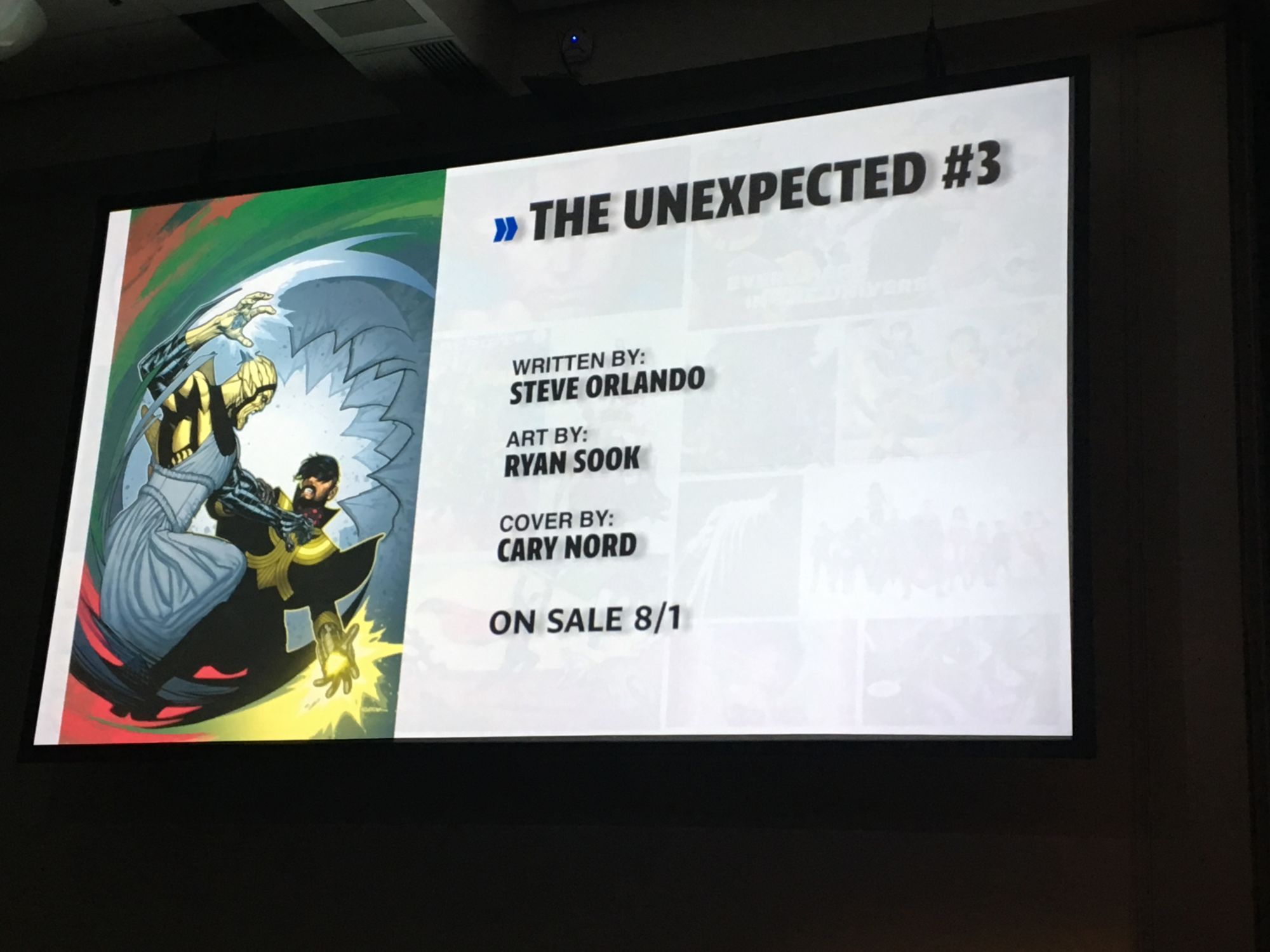 DiDio was late to the panel because he was in Hall H watching the Aquaman movie trailer. "If there was ever a time I wanted to have Sideways' power it was then!" He asked that no one watch the trailer now during this panel but that they should "go to a Marvel panel and watch DC stuff there. No, I'm just kidding… don't go to a Marvel panel."