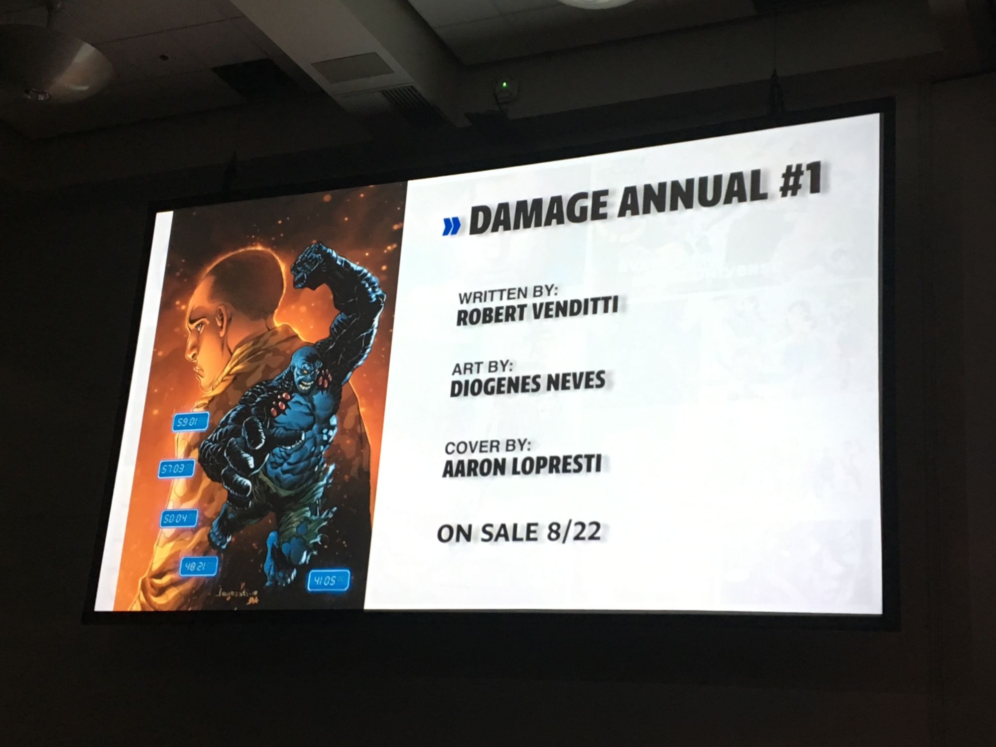 Vendetti is writing Damage, a book about someone who wanted to become a superhero but received abilities that only work for one hour and require him to recuperate for the remainder of the day. Vendetti described Damage as "walking destruction wherever he goes" and says that the plot is driven "mostly by what artist Tony Daniel wants to draw." It will be revealed that classic DC war character the Unknown Soldier has been working with Damage from the beginning. Vendetti is a huge fan of the property and is overjoyed that he can work with the character. The Damage Annual will feature a cover by Aaron Lopresti.