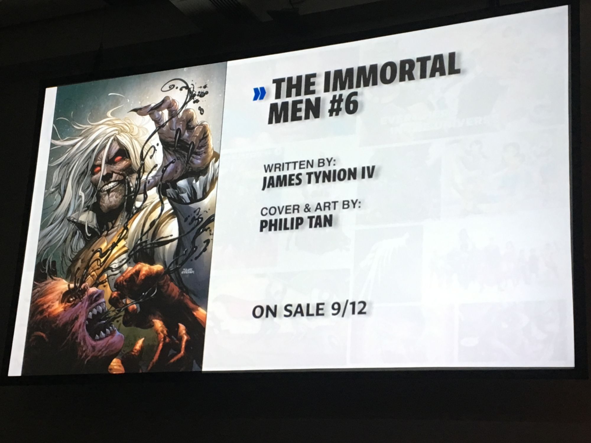 Tynion had Jim Lee pitch him the Immortal Man, which was something he was not expecting, and it gradually became the Immortal Men. Lee designed the characters but Benjamin provides art for the series. Tynion thinks of the series as "if the Matrix was a Final Fantasy game that came out as an early WildStorm comic." The title features various 'houses' filled with immortals who have driven the course of human history. The Batman Who Laughs is in the book and "may appear again soon."