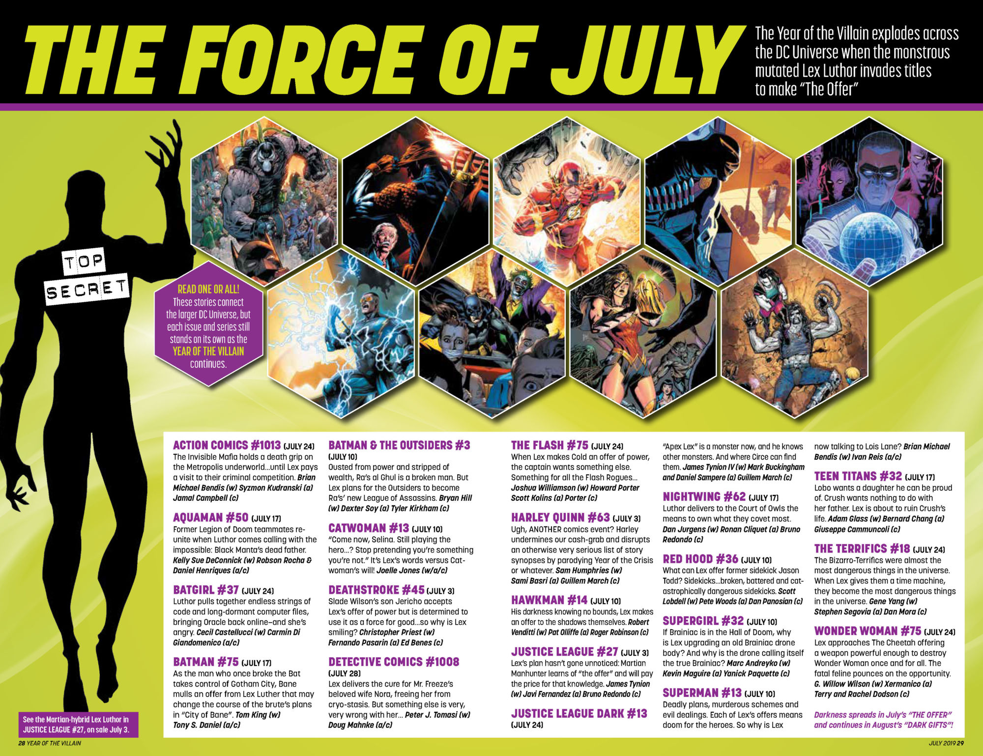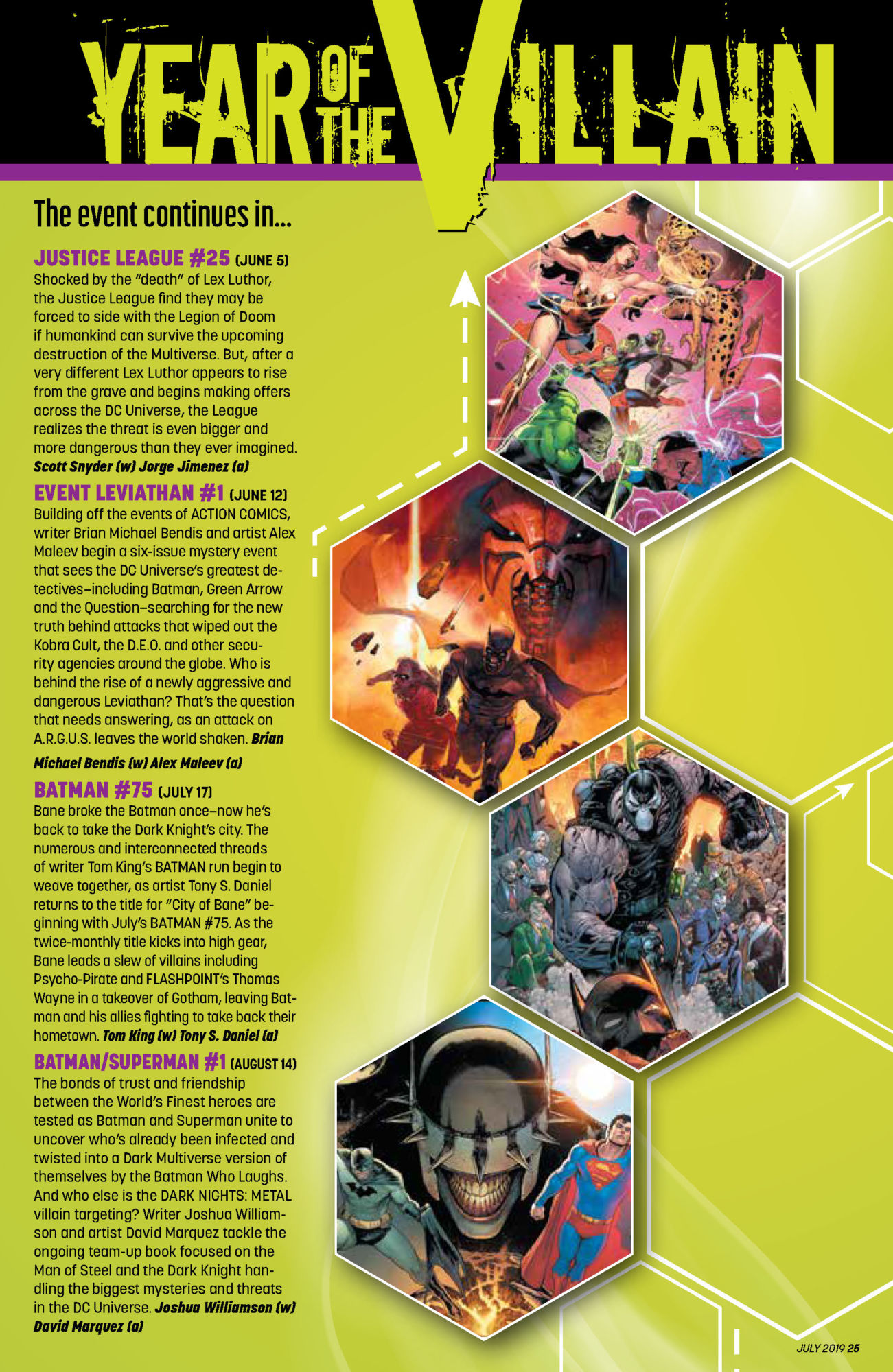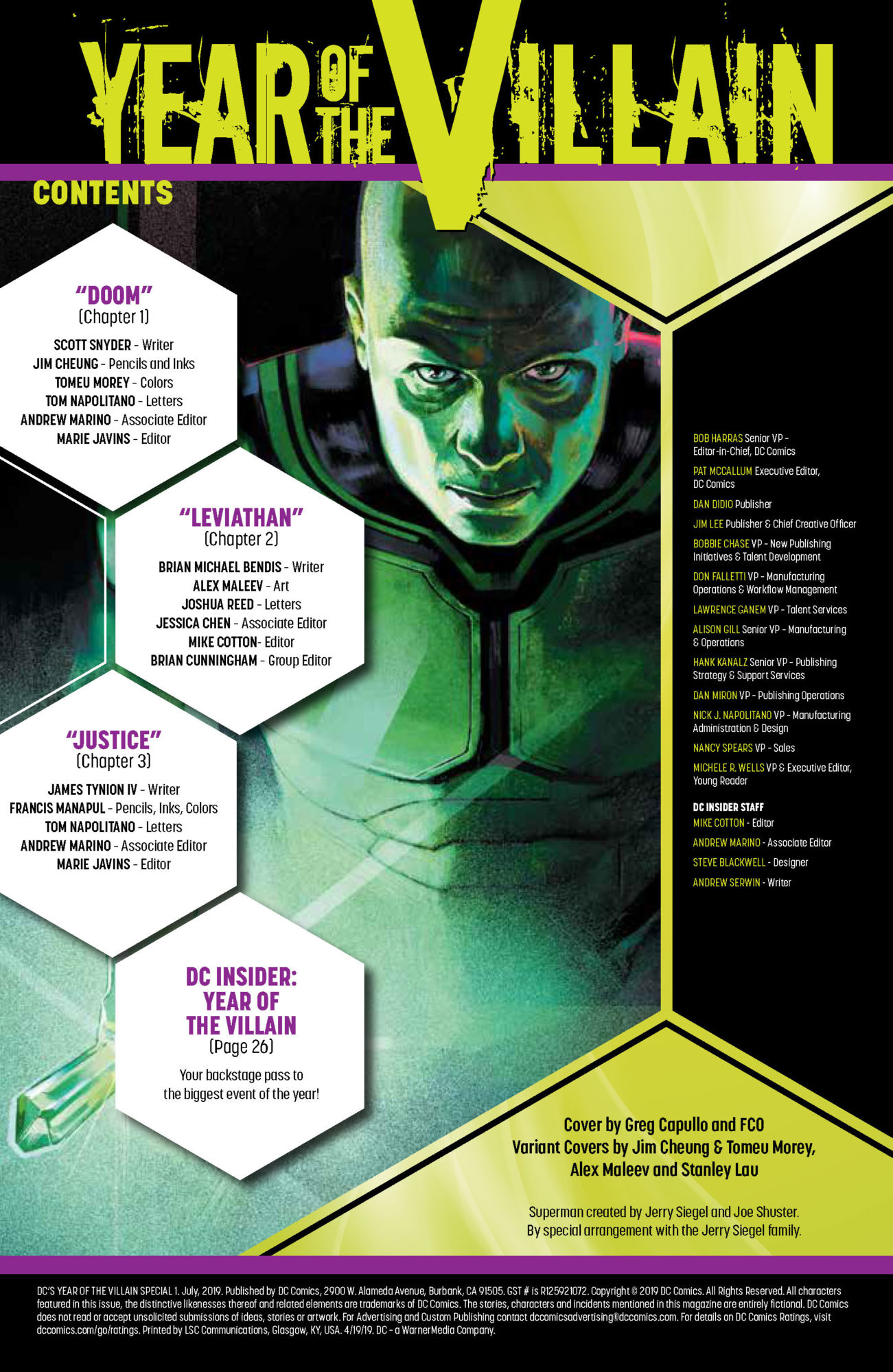 Evil is winning! Lex Luthor and The Legion of Doom conspire with Cosmic Gods, bending mankind toward a dark destiny. Elsewhere, the scourge of Leviathan spreads unchecked, seizing power in every corner of the world. And all the while the Batman Who Laughs busies himself in the shadows, aligned with no one-yet with sinister plans for all. The carnage starts here as the badguys take center stage in "The Year of the Villain," the most treacherous event in DC Comics history. Some act with united goals, others with plans selfish and secret, every one of them on a monstrous collision course against Batman, Superman and the heroes of the DC Universe. And our heroes will fail us. Don't miss the start of "The Year of the Villain," featuring the talents of writers Brian Michael Bendis, Scott Snyder and James Tynion IV, artists Jim Cheung, Alex Maleev and Francis Manapul and cover artist Greg Capullo-all for just $0.25!In Shops: May 01, 2019 SRP: $0.25
