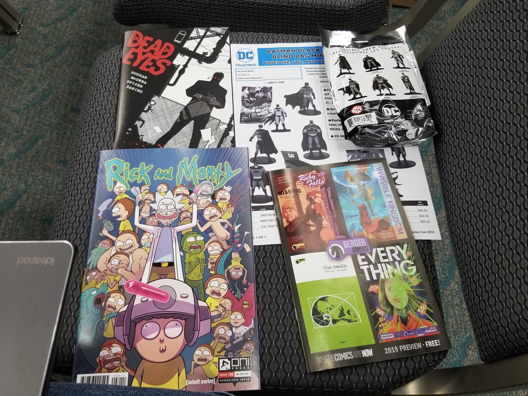 There's an advance copy of Gerry Duggan and John McCrea's Dead Rabbit Eyes that we talked about earlier, some exclusive Rick & Morty stuff from Oni, a look at Dark Horse's comics and a blind bag Batman from DC… and this is just what they put on the seats, let alone what they'll have to line up for later…