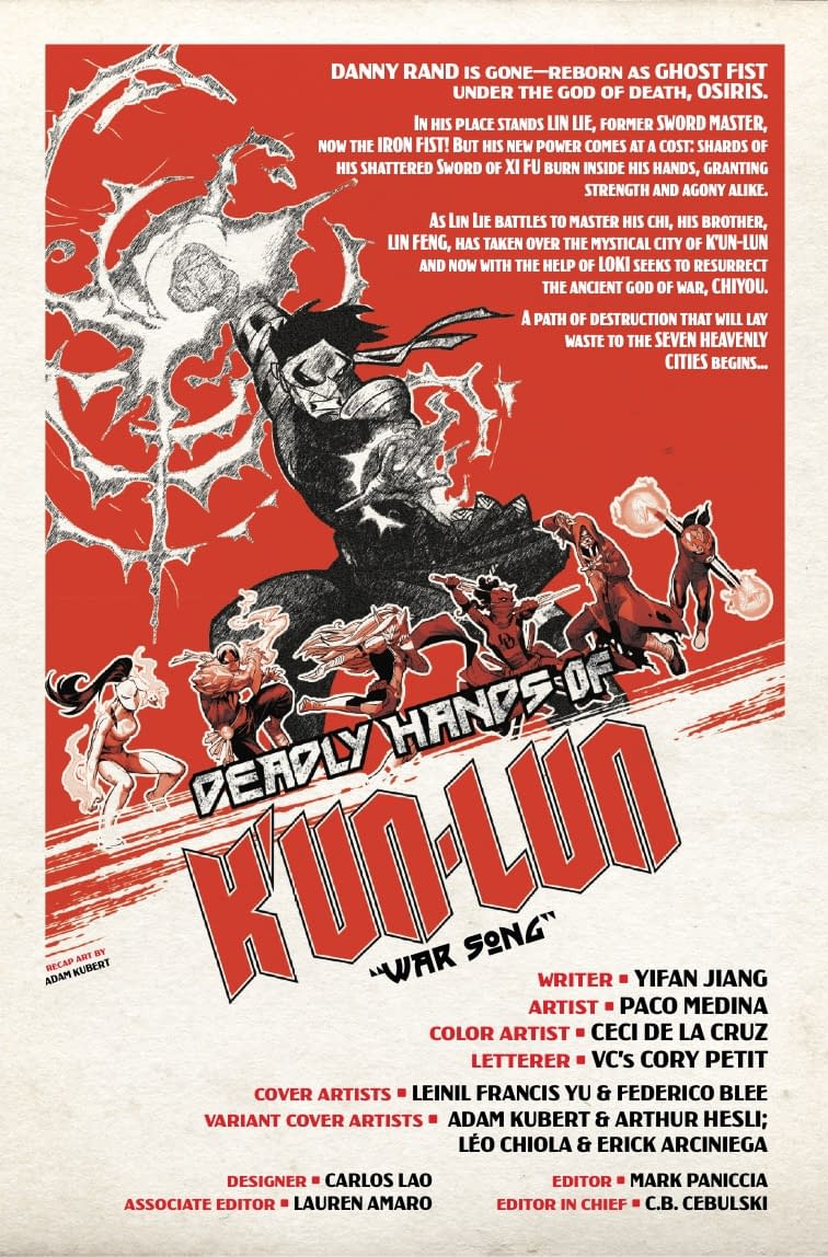 - Interior preview page from 75960621359700111 DEADLY HANDS OF K'UN-LUN #1 LEINIL YU COVER, by Yigan Jiang & Paco Medina & Leinil Yu, in stores Wednesday, February 18, 2026 from Marvel