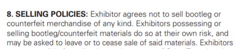 The exhibitor application contract for Rose City Comic Con, states that those found to be bootlegging "may be asked to leave or to cease sale of said materials" – the use of 'may' rather than 'will' leaves a lot of wiggle room.