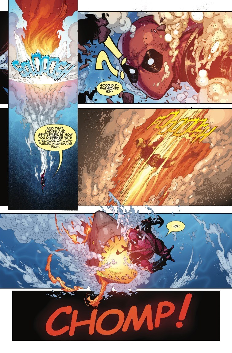 A lot of people believe that Deadpool jumped the shark years ago, possibly around the time he started lifting all his jokes from the movie Airheads, but in this preview of next week's War of the Realms: Strikeforce: War Avengers #1 (long enough title for you?), Deadpool takes jumping the shark to the next level, because he's facing off against a bunch of fire-breathing flying shark monsters…