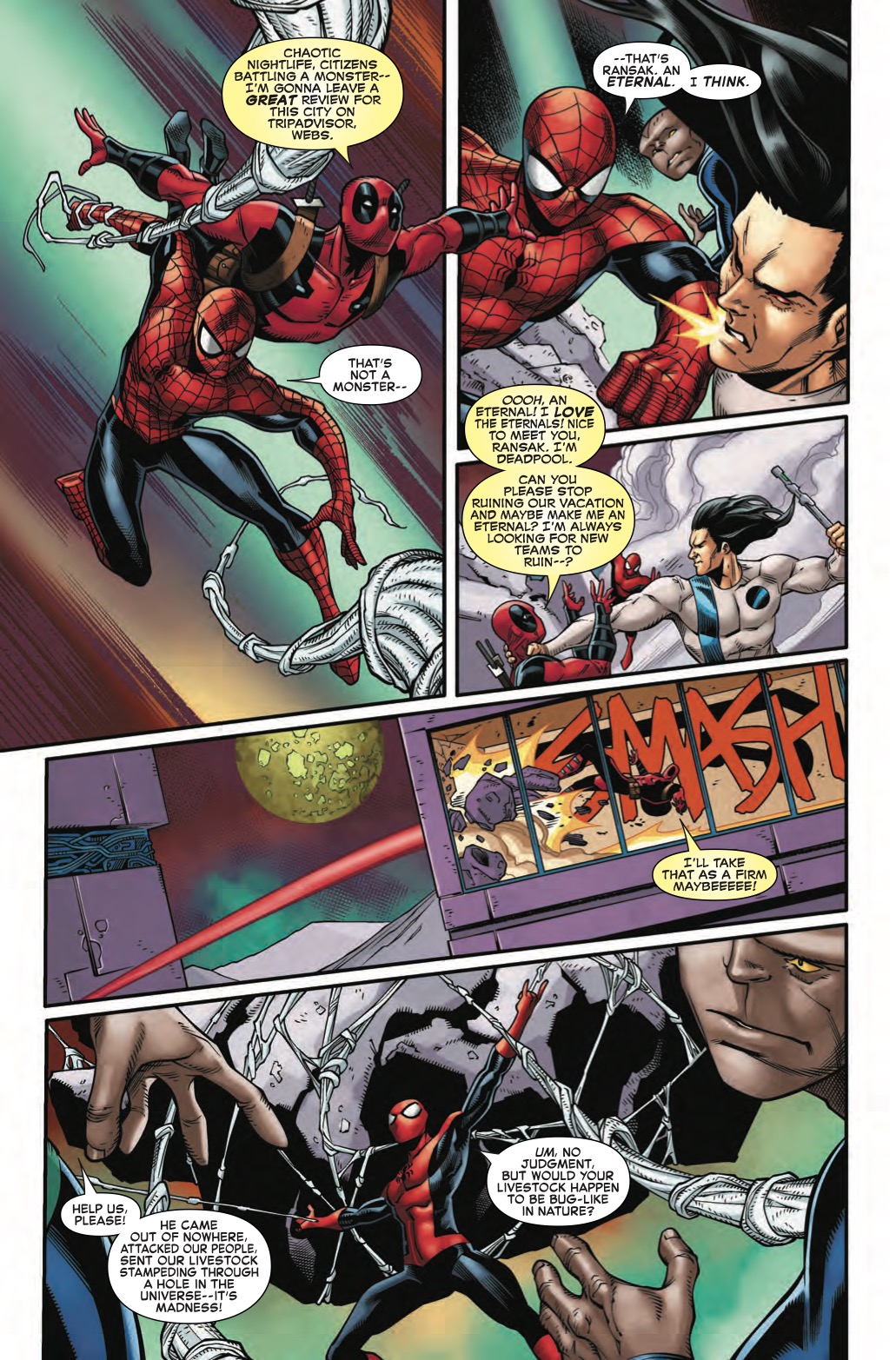 It's not their fault, however. It turns out that Ransak is the cause of the bug stampede. And when Spider-Man incorrectly identifies Ransak as an Eternal — though he's been affiliated with the group, he's actually part Inhuman and part Deviant — Deadpool jumps at the chance to ask to join the Eternals, which would, of course, give him an opportunity to appear in Chloe Zhao's upcoming Eternals film.