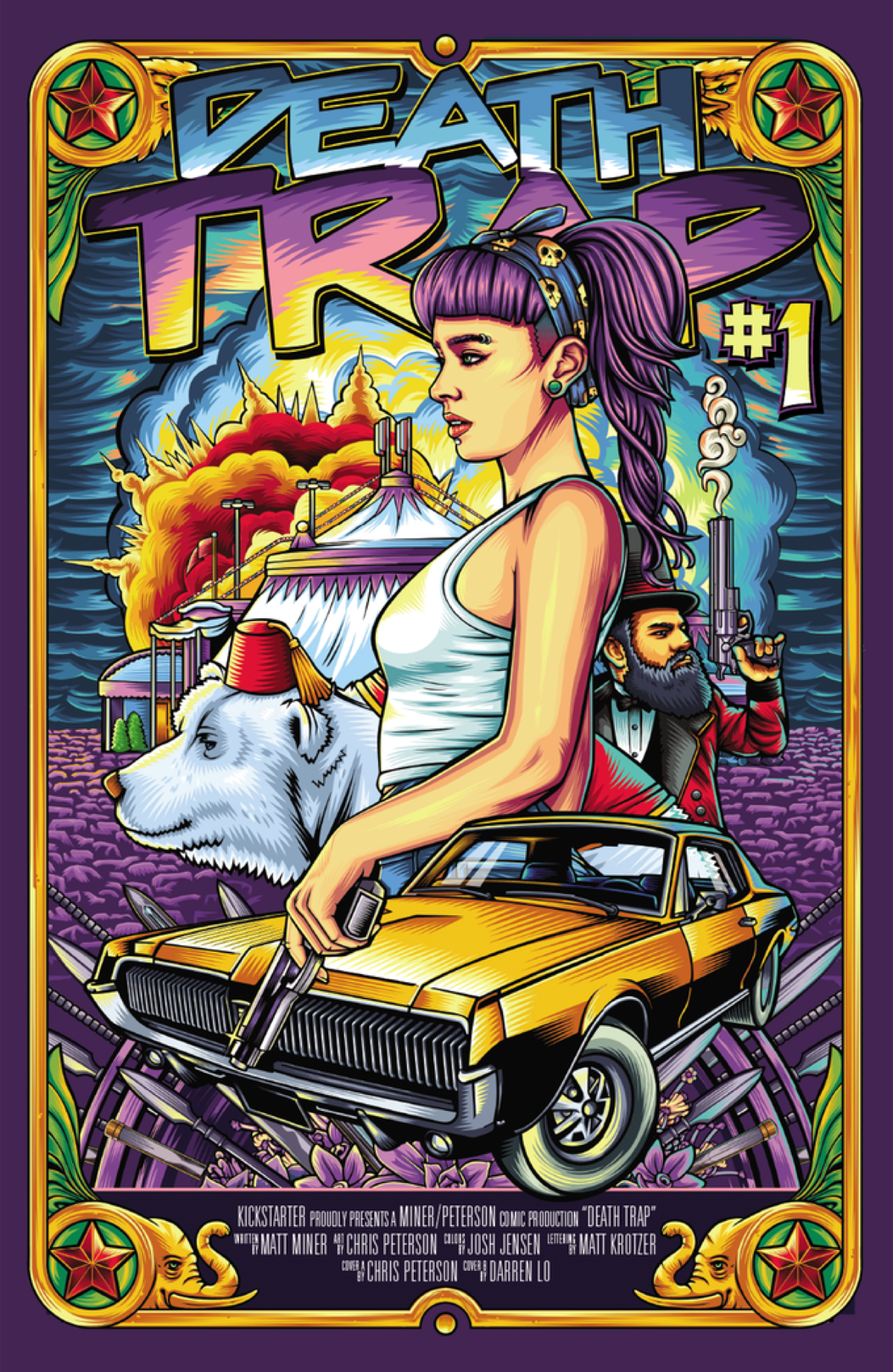 Death Trap is a brand new "carsploitation" comic book series that launched on Kickstarter today, from the creative team of handsome writer Matt Miner, artist Christopher Peterson, colorist Josh Jensen, and letterer Matt Krotzer, about a girl named Ollie teaming up with her dead father's ghost (which haunts a classic Mercury Cougar) to seek revenge on "methed-out carnies" and circus freaks. If that sounds like more action than your brain can possibly handle… wait until you see the pages!