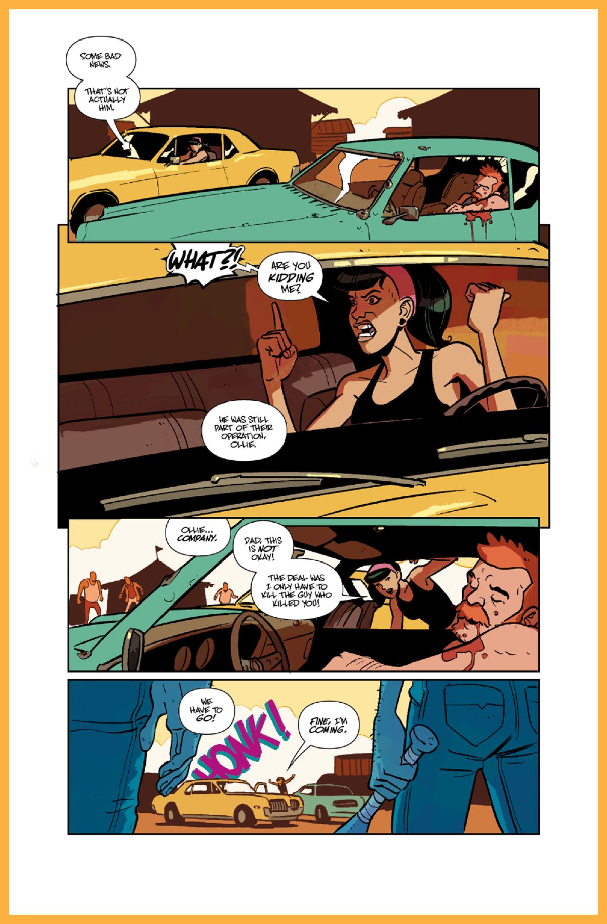 Matt Miner: It's a f'n bananas comic about a girl who teams up with the ghost of her dead father (who haunts his old muscle car) to get some revenge for his murder, in an underworld of a circus freak crime family and a bunch of methed-out carnies in a rival crime organization. It's utterly bonkers and we're having so much damn fun with it. Conjoined twins! Sad murderous European clowns! A guy who thinks he's a tiger! Dancing bears! Bearded strong women! A weirdo mermaid fish girl! A hitman nicknamed "Bob" because of his bobblehead obsession! And, tons more.