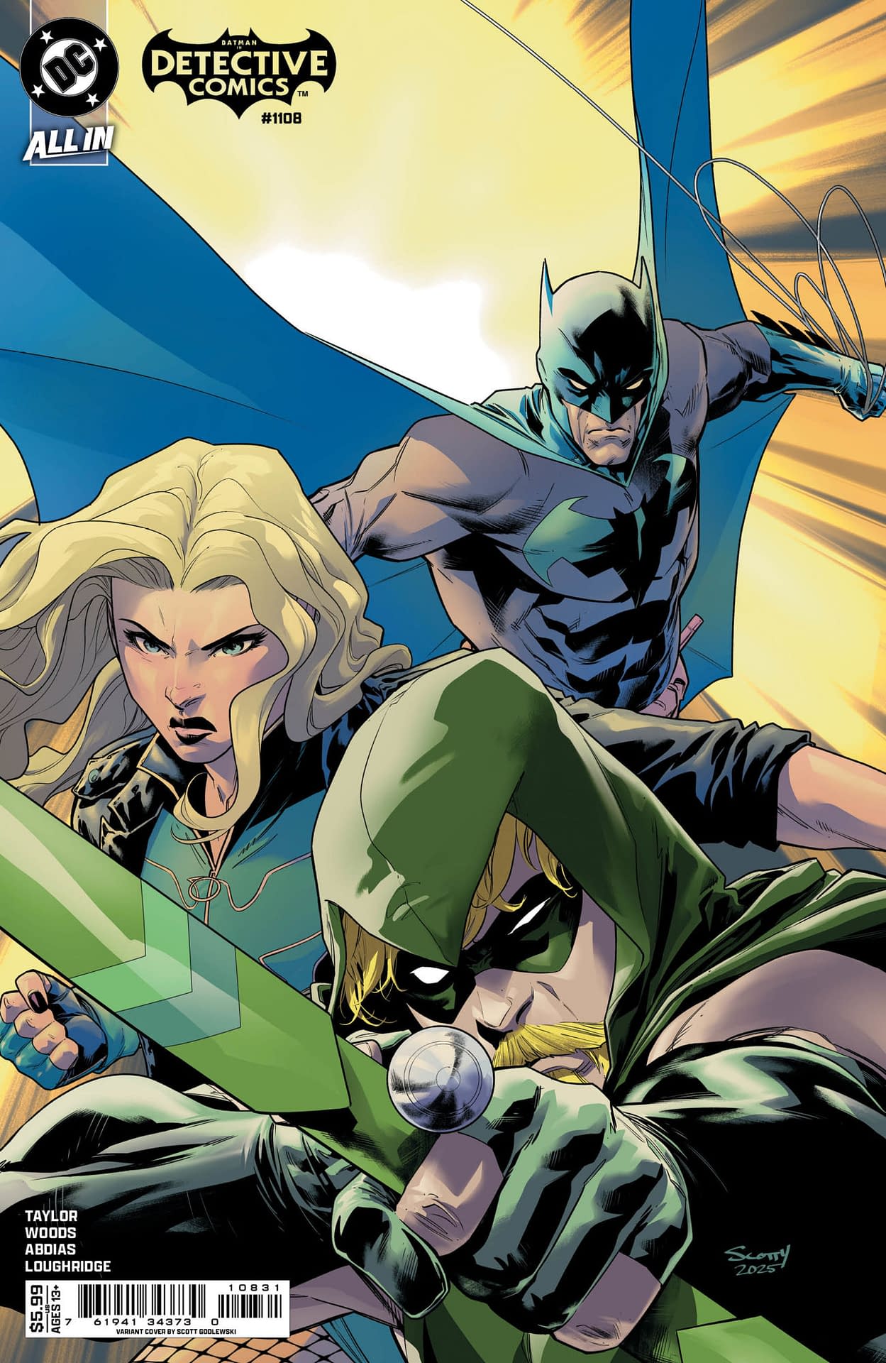 - Cover image for 0226DC0110 Detective Comics #1108 Scott Godlewski Cover, by (W) Tom Taylor (A) Pete Woods (CA) Scott Godlewski, in stores Wednesday, April 22, 2026 from DC Comics