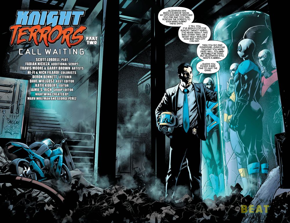 DC Comics PR has handed the preview for Nightwing #51 to the Comics Beat for Nightwing #51, ahead of publication this week. Solicited as written by Scott Lobdell, well, after Benjamin Percy hurriedly left the comic, he has now been joined on the issue in question by his fellow nineties X-Men writer Fabian Nicieza, credited with additional dialogue. Putting together the writing team that sold millions of mutant comic books, their mission today is to rename and reestablish whoever or whatever Nightwing is now.