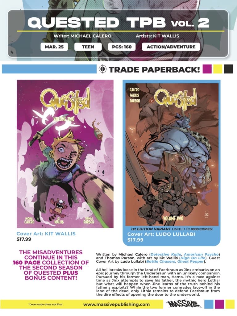 - Quested TP Vol 02 by Michael Calero, Thomas Parson, and Kit Wallis continues the fantasy adventure saga.