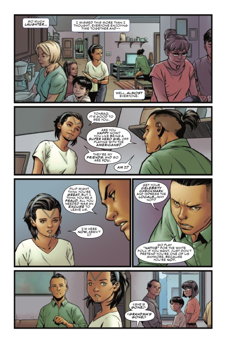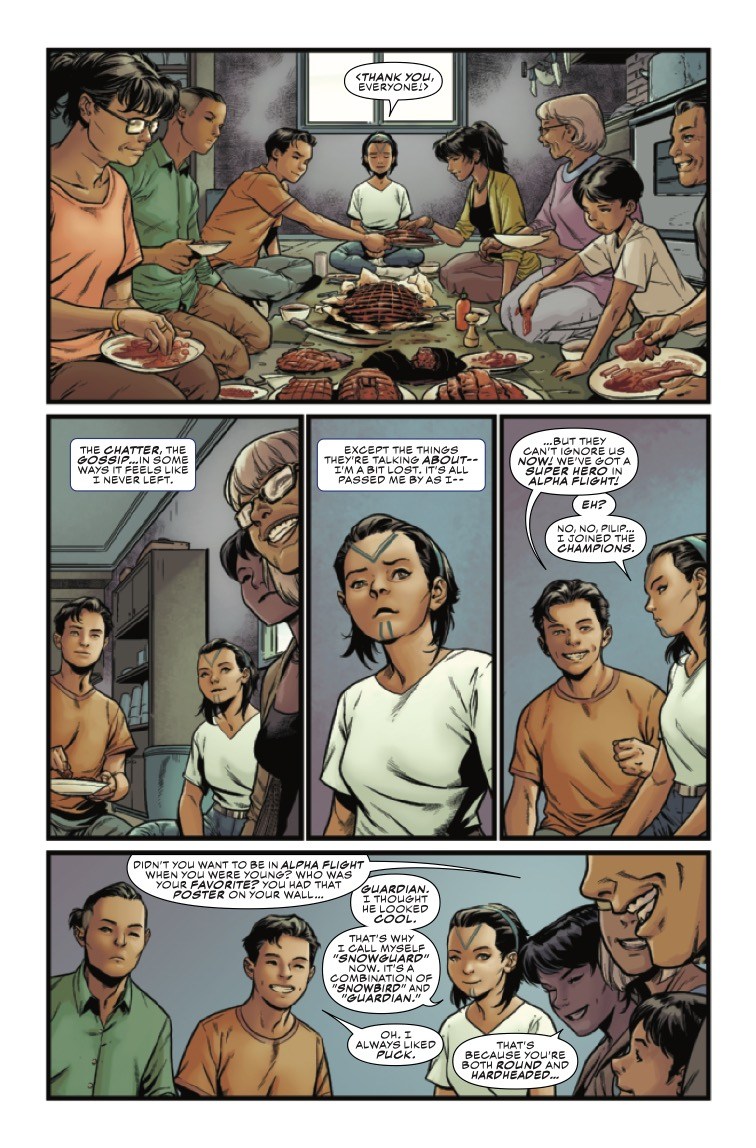 In next week's Champions Annual #1, Snowguard returns home for the first time since joining the Champions, but if you thought that being a famous superhero would excuse her from dealing with the same bull@#$% everyone else does when they get together with family, you'd be dead wrong! Snowguard is barely back when her family immediately launches into a political discussion at the dinner table!