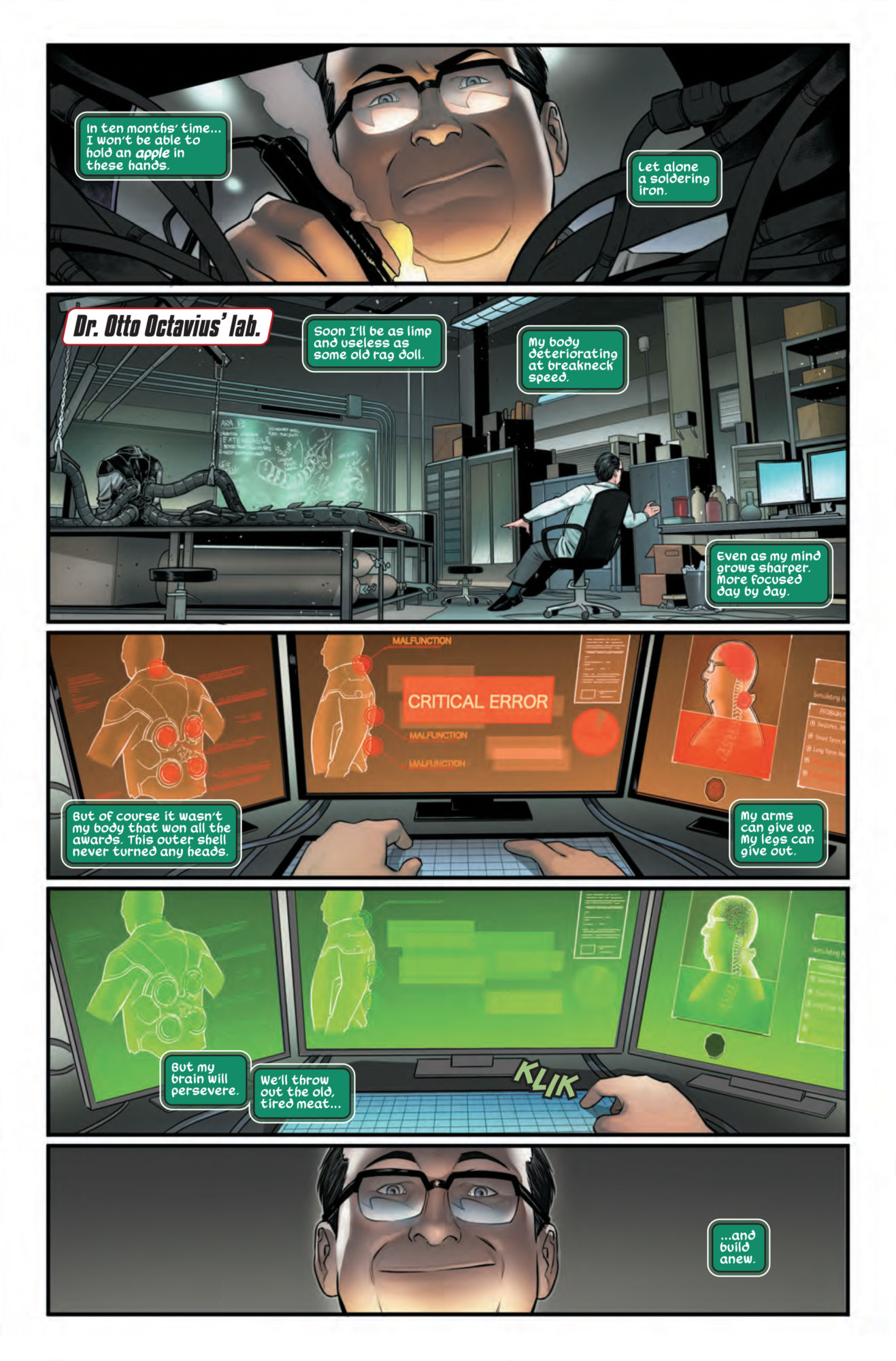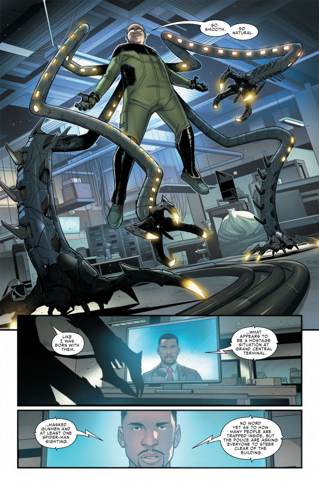 Feeling insecure is only human, and even a brilliant supervillain like Doctor Octopus experiences poor self esteem sometimes. That's where we find the good Doctor in this preview of Spider-Man: City at War #4. Doc Ock views his body as deteriorating, and he's not really consoled by his obviously sparkling personality…