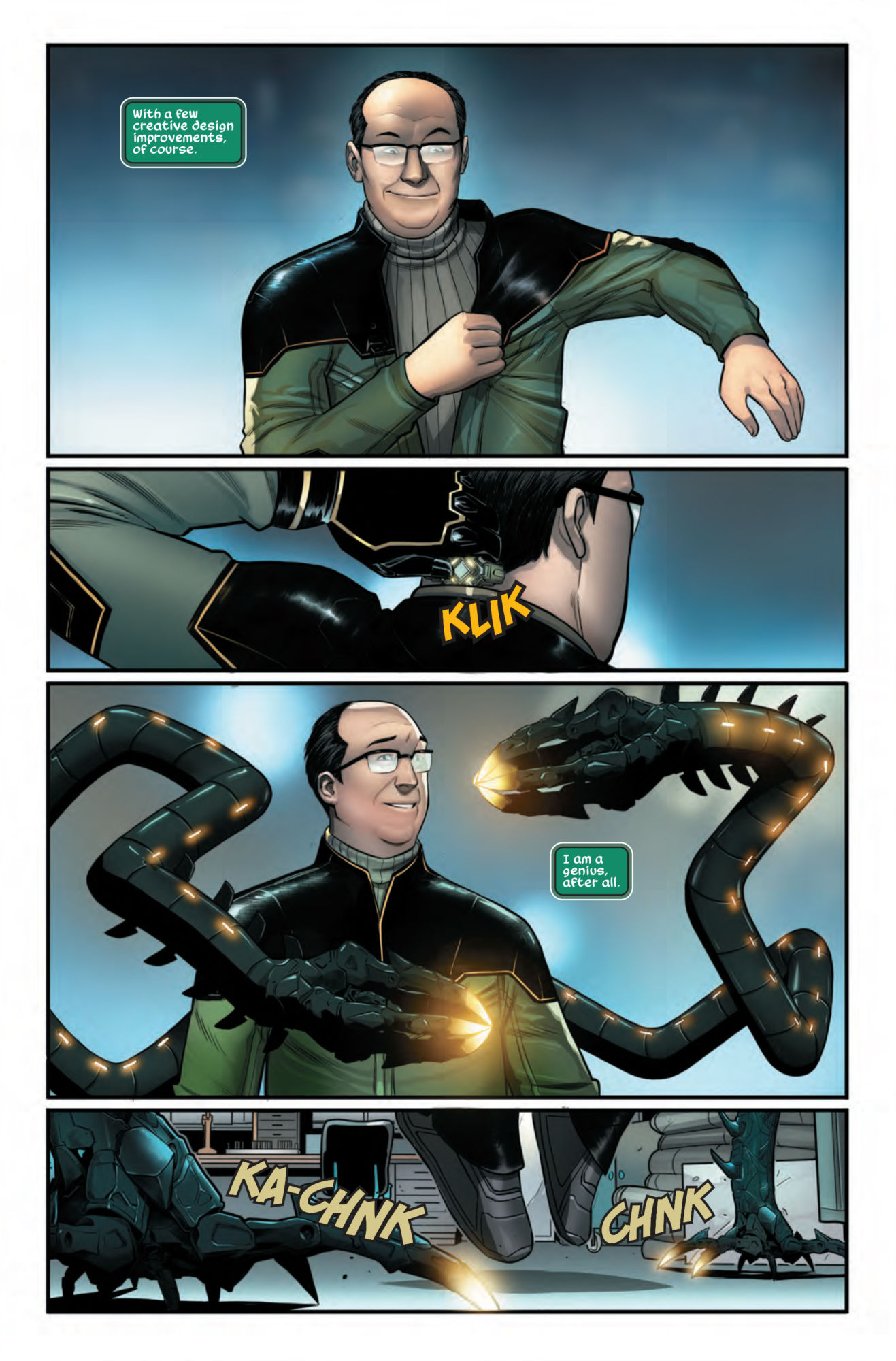 In his heart, Doc Ock knows that it's what's on the inside that counts: his brilliant and evil brain. But he's just not satisfied with what's on the outside.