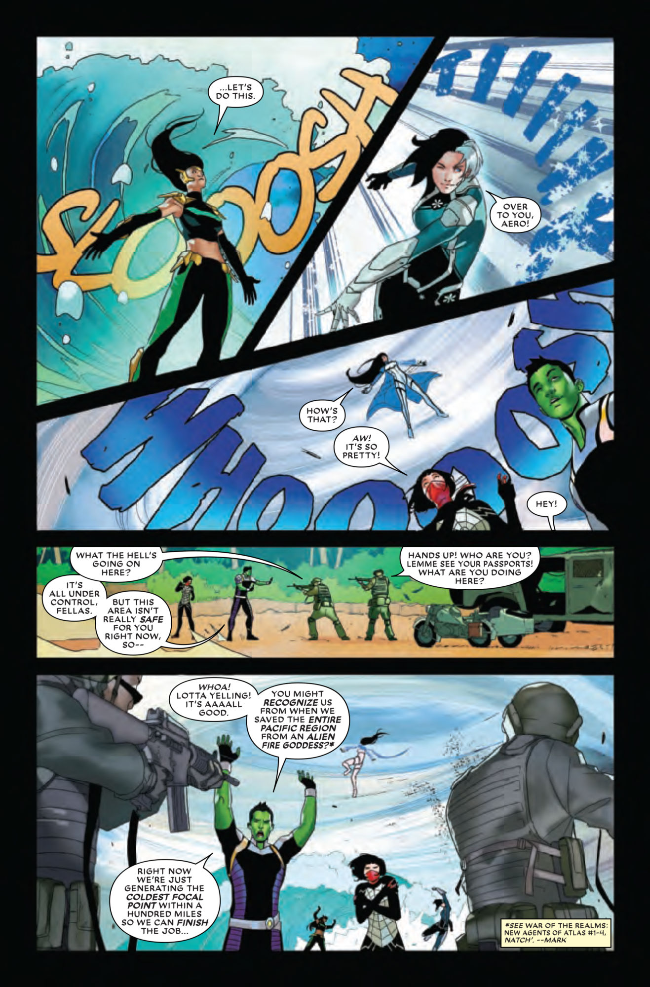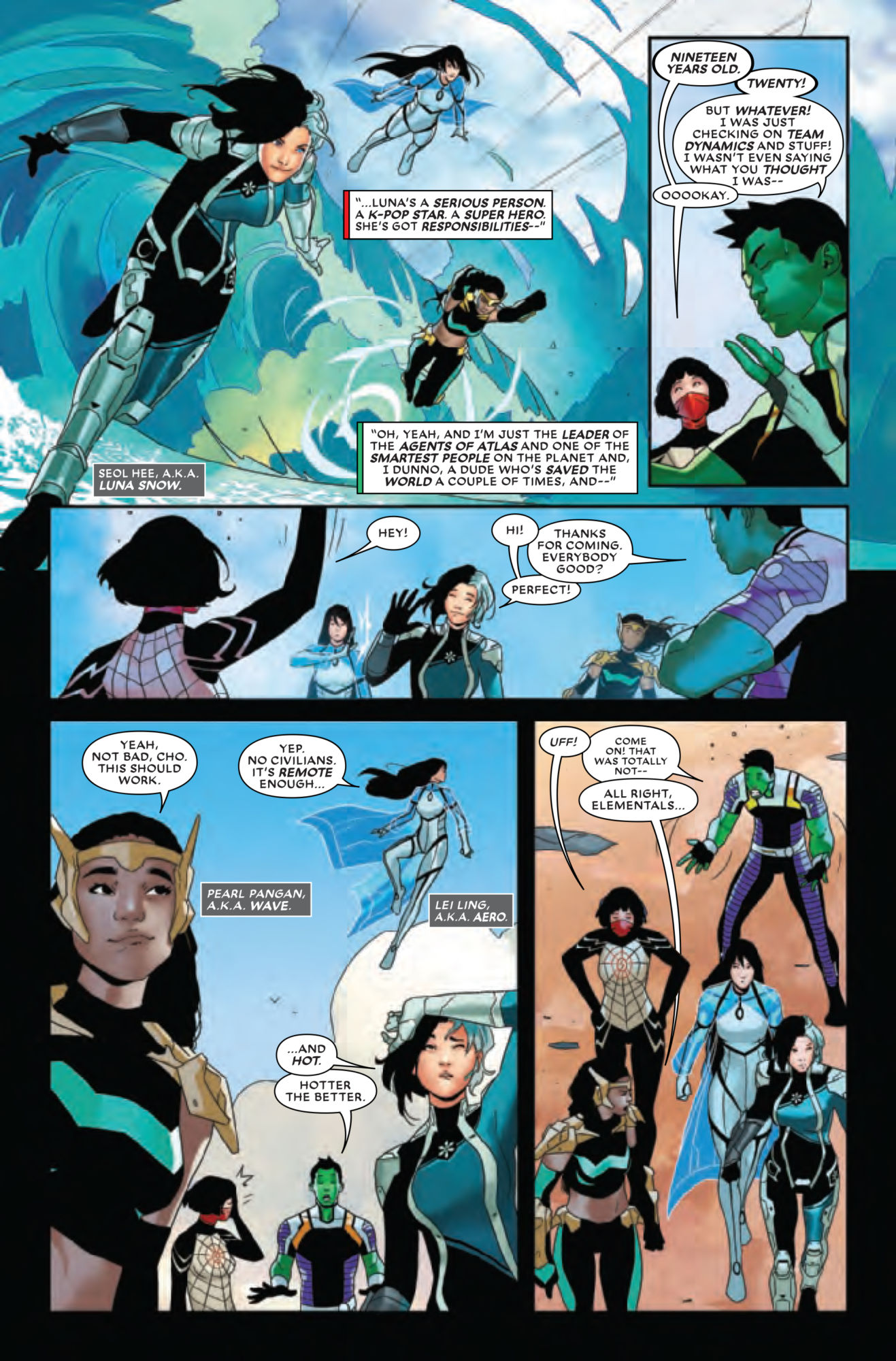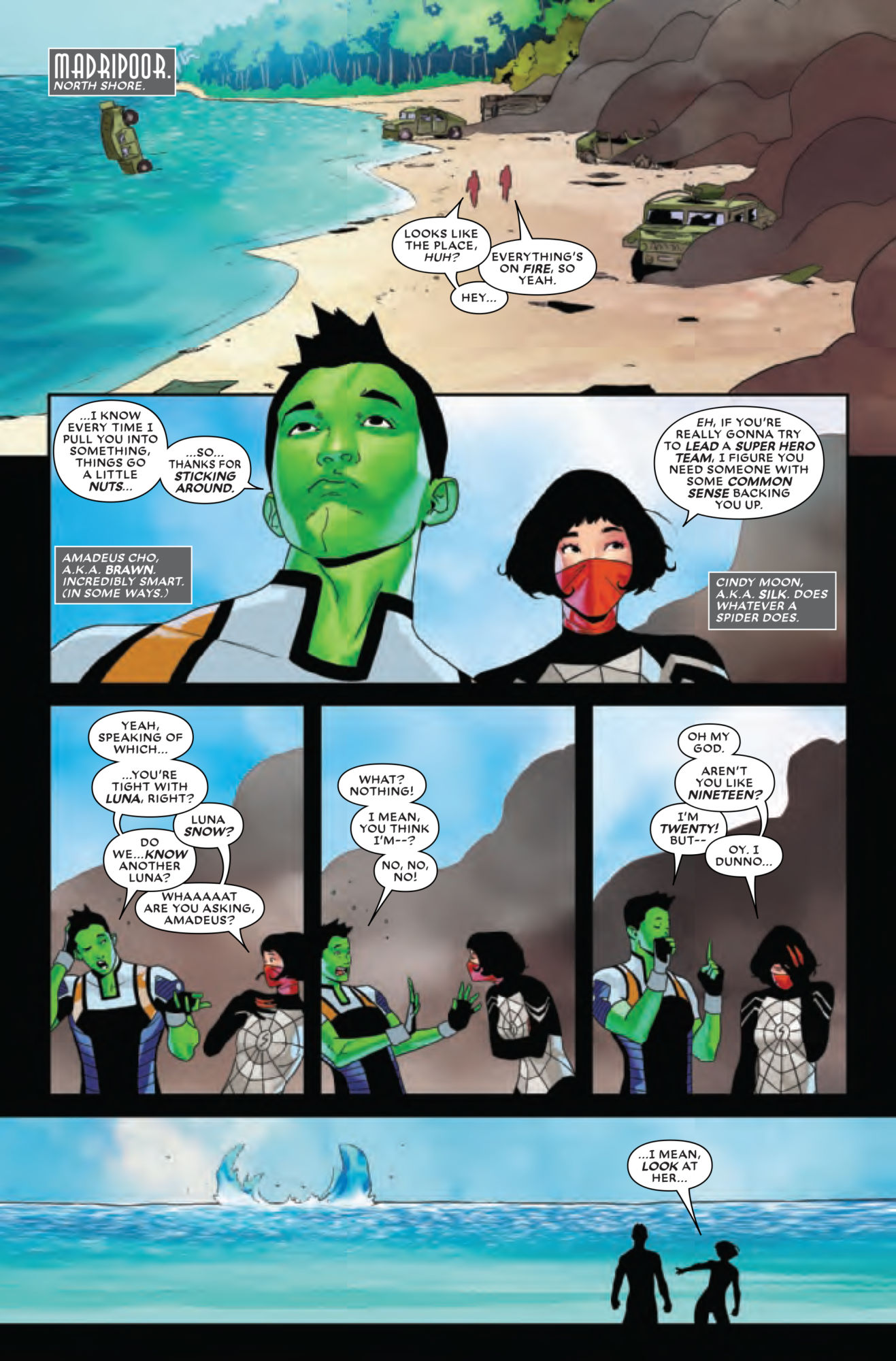 Amadeus and Luna, sitting in a tree, K-I-S-S-I-N-G? That appears to be what Amadeus Cho is hoping for in this preview of Agents of Atlas #1, which sees Amadeus chatting with Silk on a Madripoor beach, casually looking for info on the romantic availability of Luna Snow…