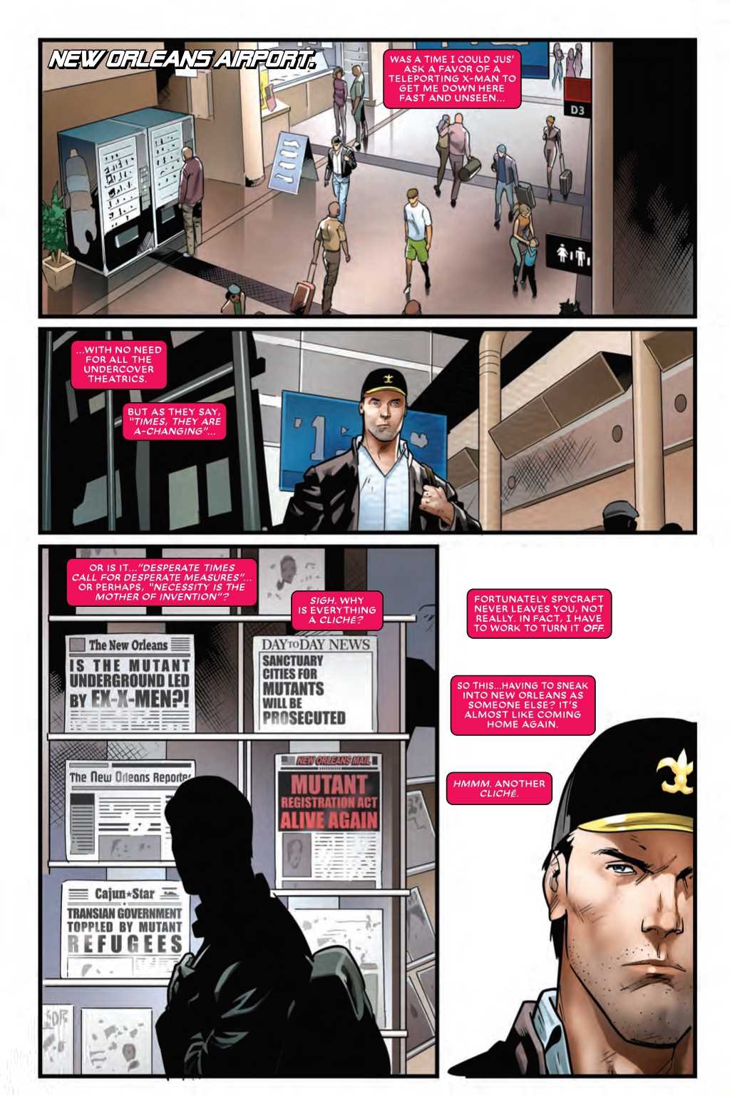 Mr. and Mrs. X is ending soon to make way for Jonathan Hickman's fancy-pants X-Men reboot. Many are excited about it, but maybe there are some people who aren't really interested in the third X-Men relaunch in a year's span, and some who perhaps don't want a 150-issue intellectual X-epic that requires new charts and symbols each issue to explain. Gambit, after all, is a simple man, and we find him in this preview of Mr. and Mrs. X #11 contemplating his future with the X-Men.