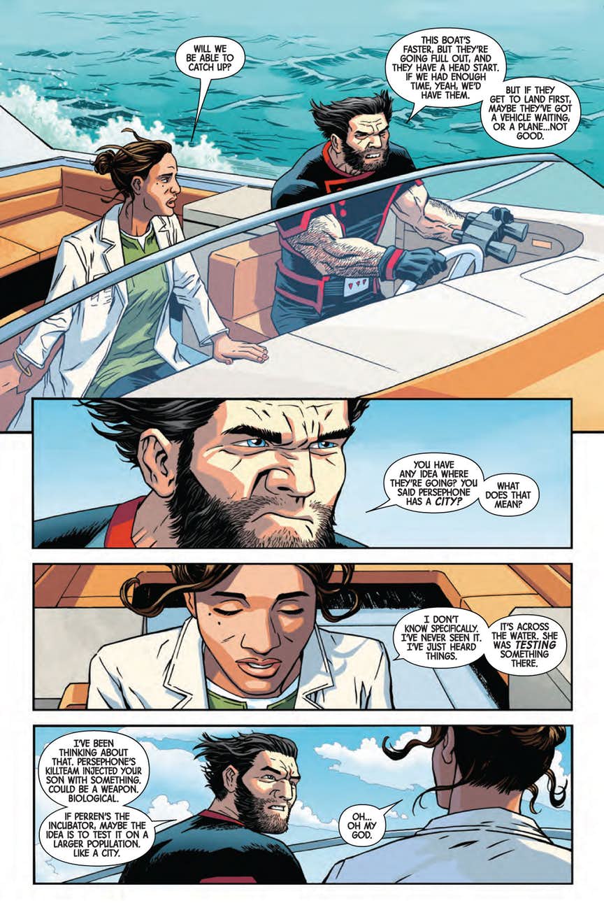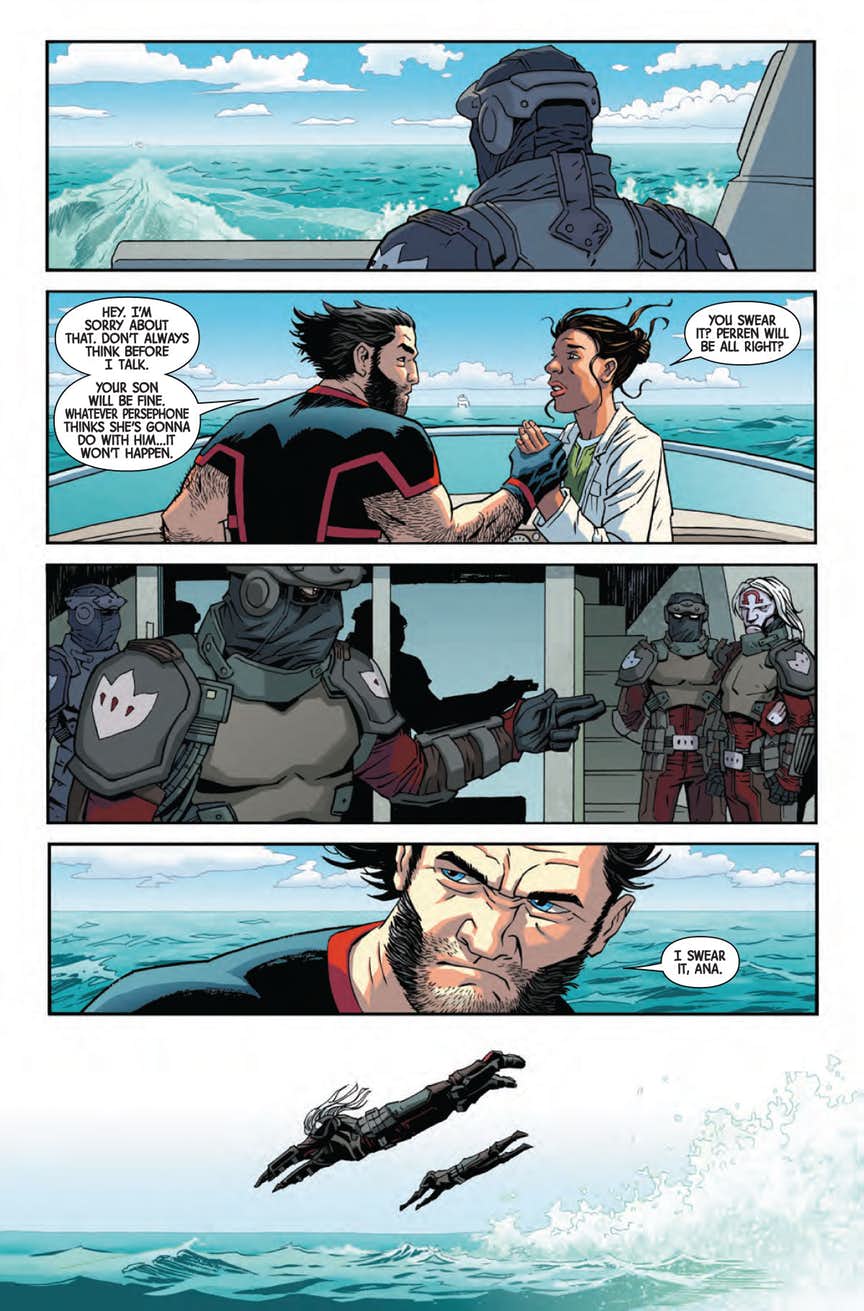 Ol' Hot Claws is seen in the preview below taking a boat ride with his new friend Ana, on his way to stop Persephone and rescue Ana's son, something Wolverine swears will happen. But people, especially children, aren't known to live very long around the ol' Canucklehead. Has Wolverine promised something he won't be able to deliver? Almost certainly. The only question is whether Perren will die because Wolverine was unable to save him, or if Wolverine will do the deed himself while under mind control or in one of his patented berserker rages.