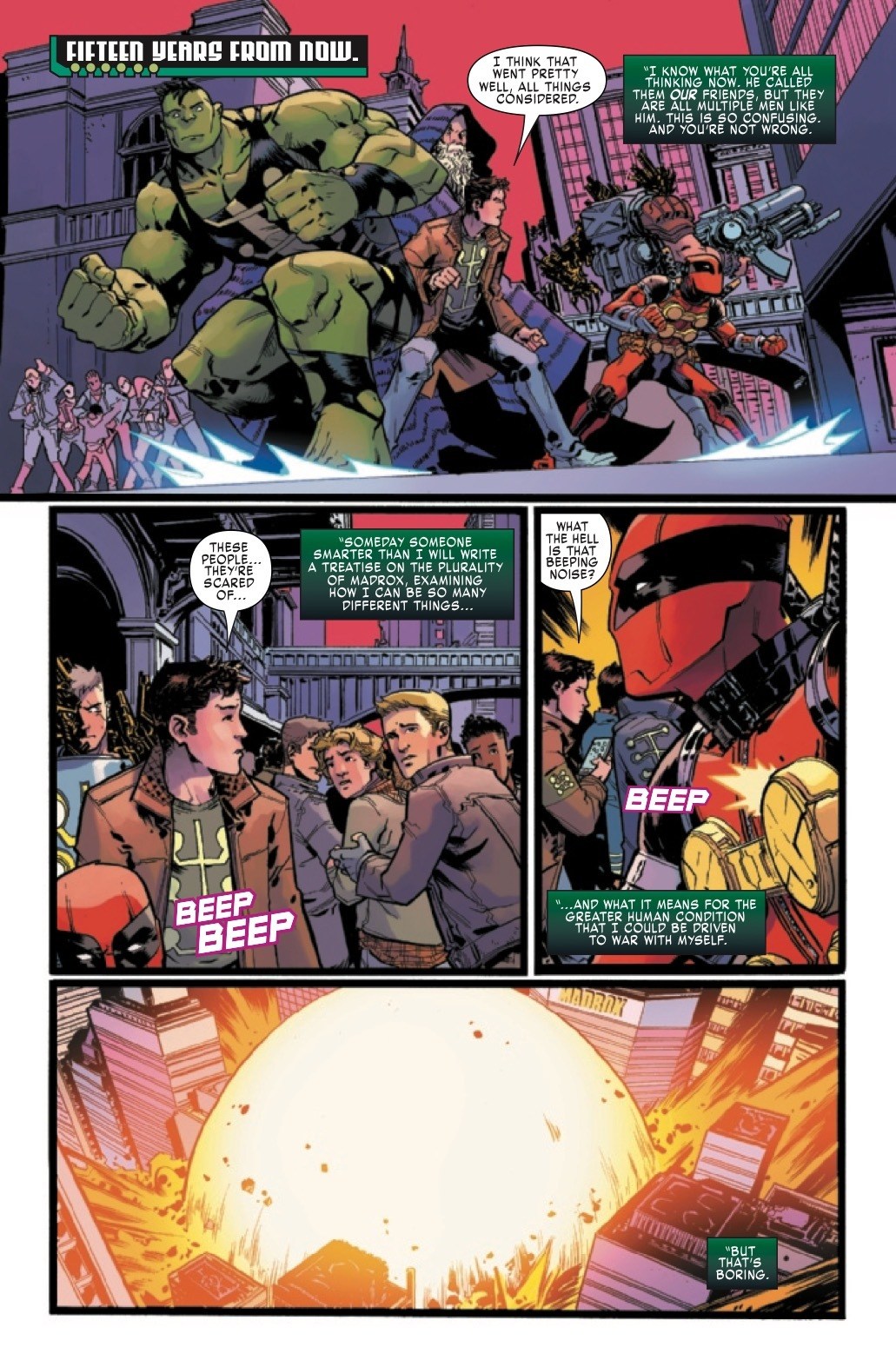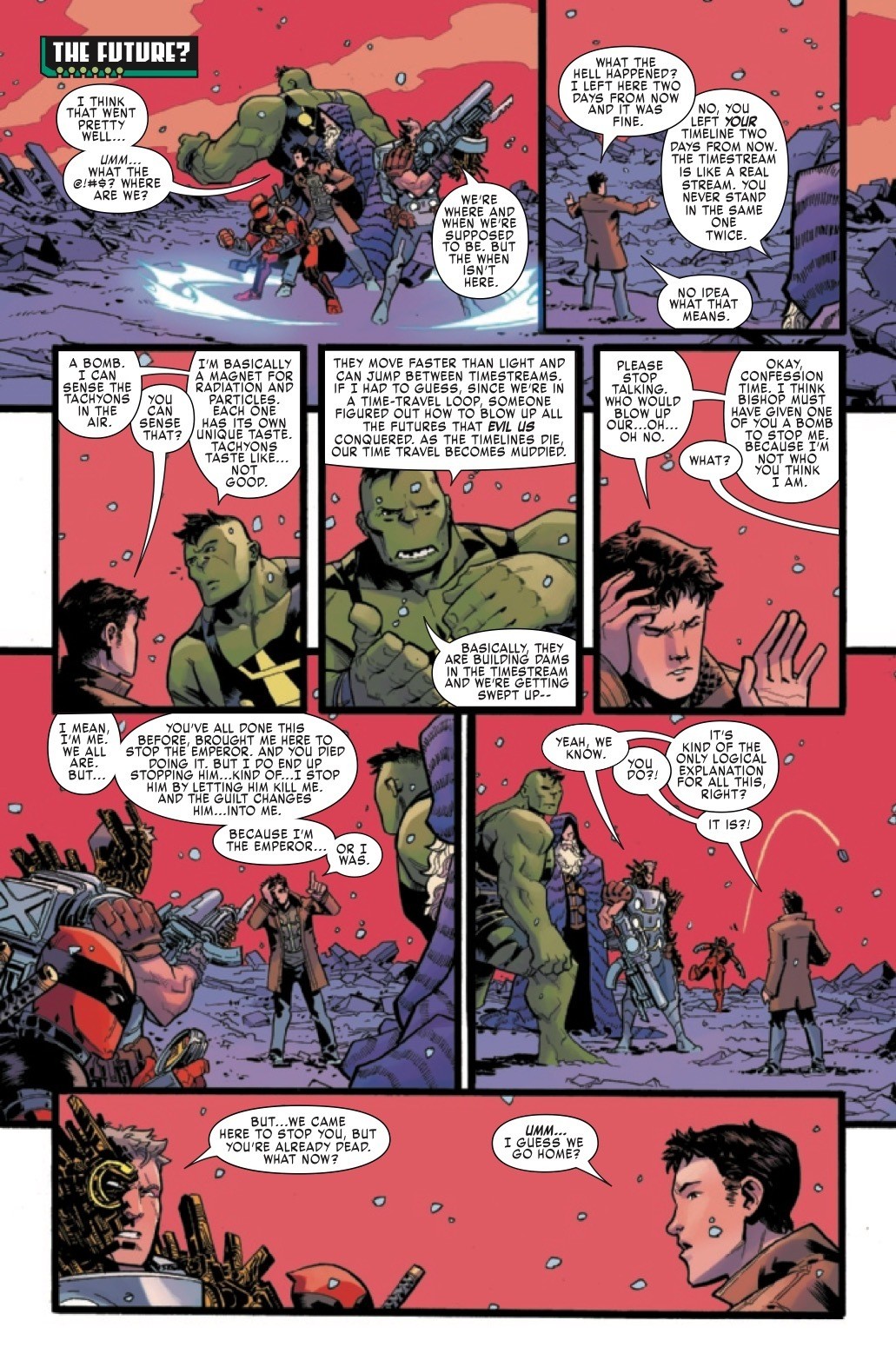 The final issue of Multiple Man finally hits stores next week, which means it's time for the series to start actually explaining to readers what's been going on with all the dupes and time travel. And in this preview of Multiple Man #5, we start getting those explanations already, with Hulk Jamie explaining first what tachyons are, and then explaining what's been happening with the time travel.