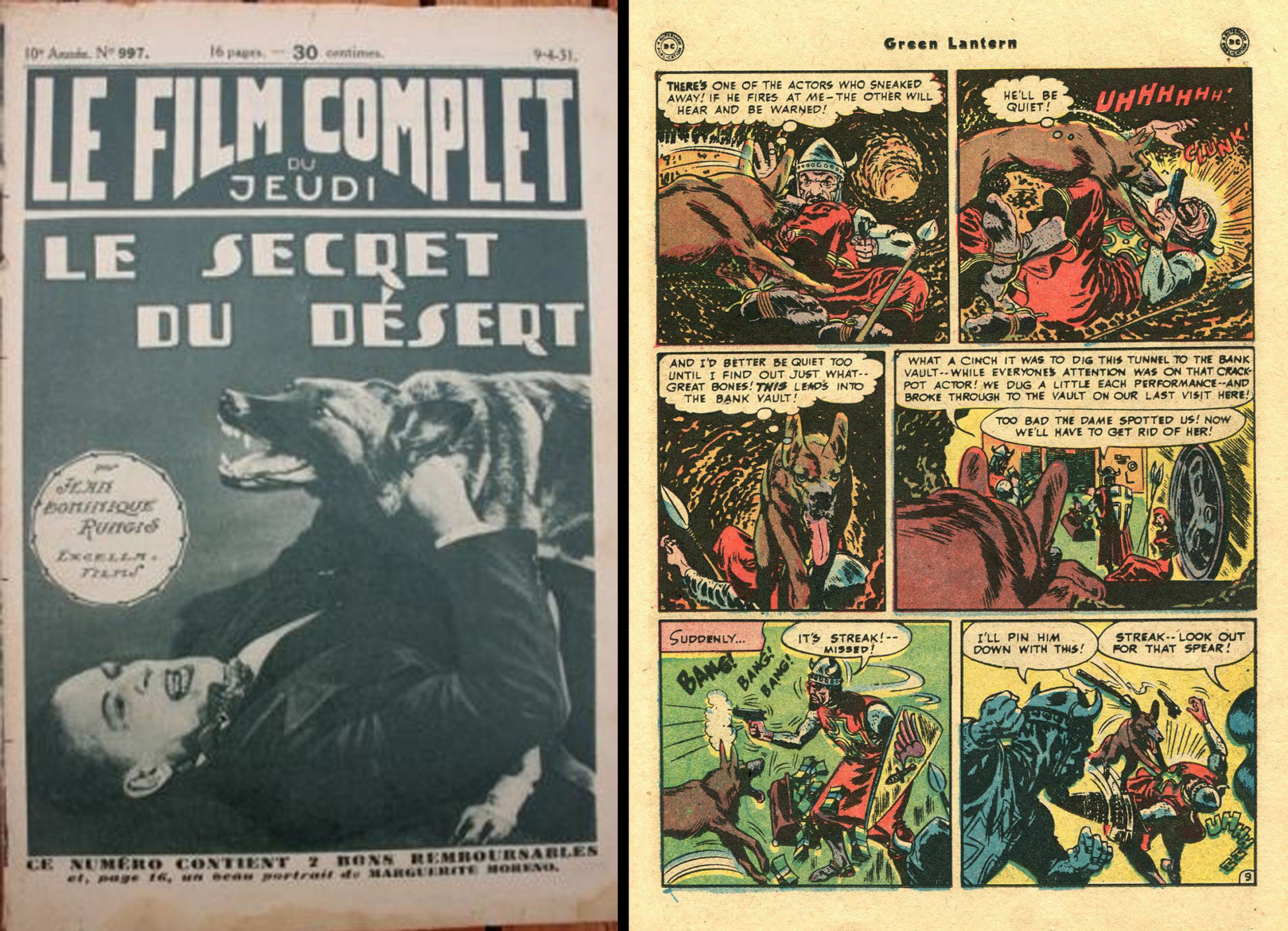 Streak appears to be at least in part inspired by the forgotten film dog star of the 1920s and 1930s, Silver Streak the Wonder Dog. Movie star Silver Streak was a brown colored German Shepherd with a very similar appearance to his comic book counterpart. While some other dog stars are often played for comedy, both Streak and Silver Streak were also sometimes depicted to be very aggressive in pursuit of comic book and film justice. Film titles like The Snarl of Hate and Fangs of Justice set the tone for the original Silver Streak's adventures.