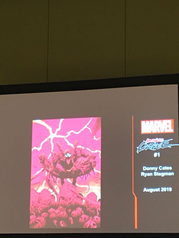 Absolute Carnage launching in August will see Carnage coming back to hunt and kill everyone who has every character who has ever worn a symbiote. Donny makes a joke that Absolute Carnage #1 written by him and Ryan Stegman will outsell Jim Lee's Uncanny X-Men #1.
