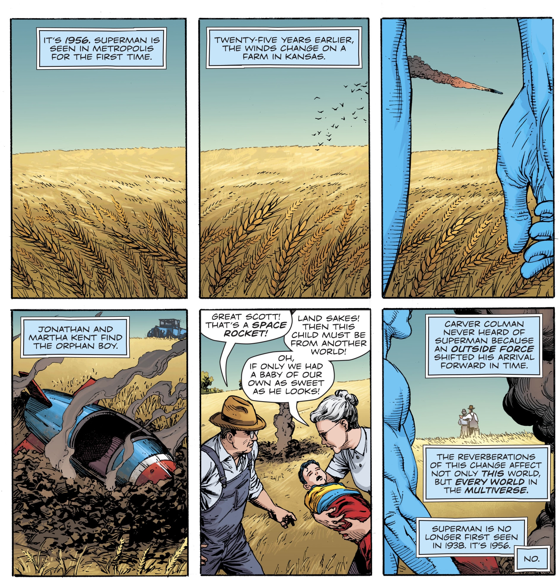 And then we get the big one. We have been told that Dr Manhattan has been retconned into being responsible for the events of the New 52, the 2011 reboot if the DC Universe, with a new Superman from Grant Morrison and redesigned by Jim Lee. And we have a new name for the prime reality of the Universe, and even a reference to the recent Metal series by Scott Snyder and Greg Capullo.