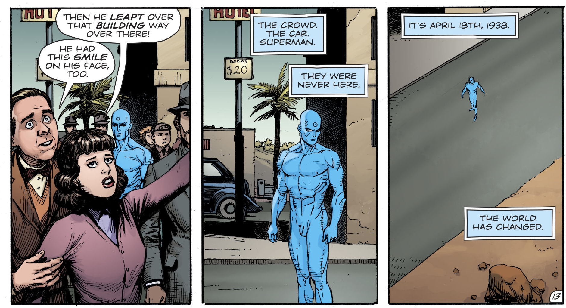 But in Doomsday Clock #10, that's clearly not the case. First, we have Dr Manhattan in 1938, the date of the publication of Action Comics #1, the first appearance of Superman.