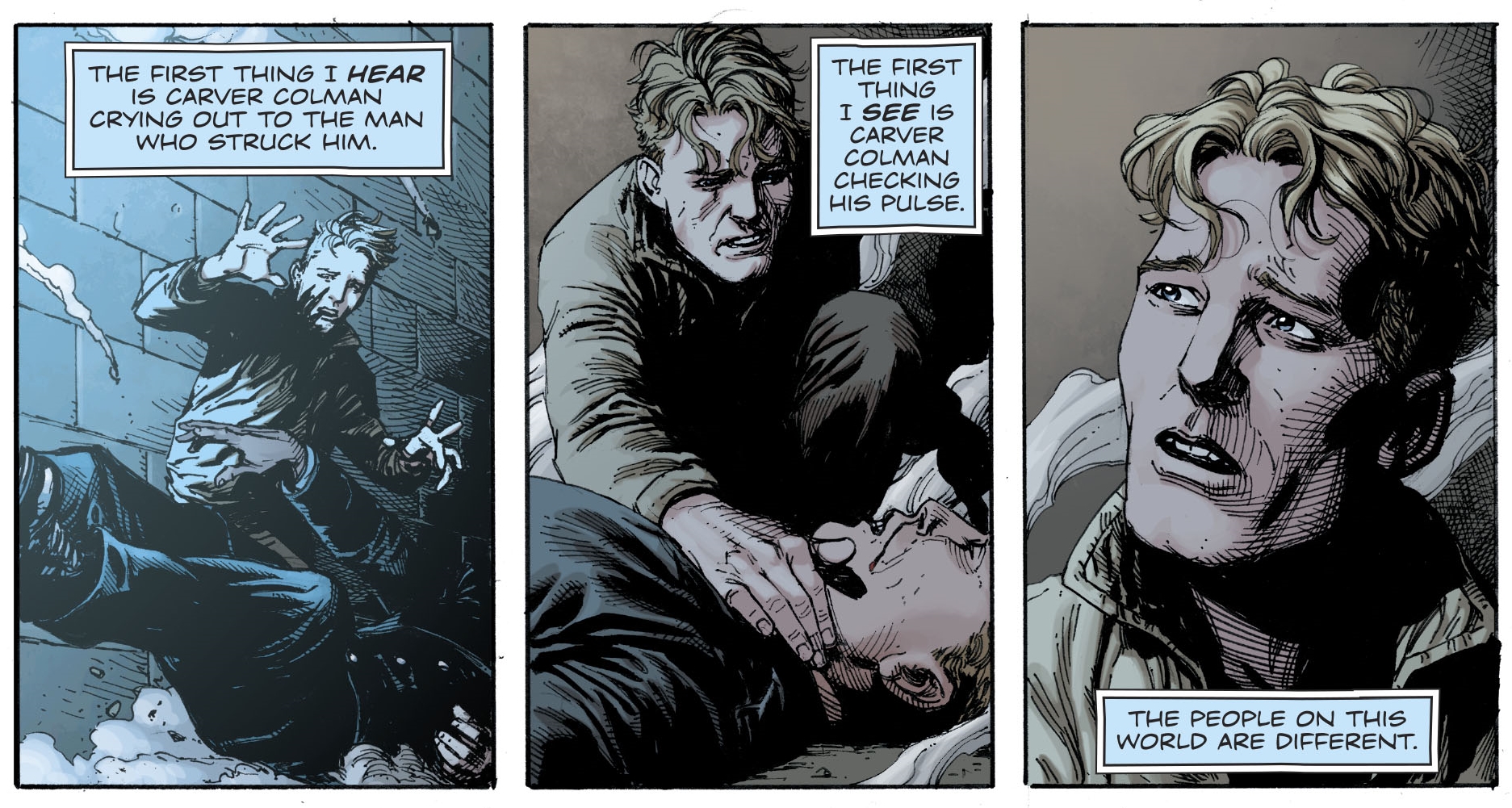 With Doomsday Clock #10, the unauthorised sequel to Watchmen by Geoff Johns and Gary Frank published by DC Comics, the purpose of Nathaniel Dusk becomes clear. It plays the role of the Black Freighter in Watchmen, it is a fictional world defined by a real world, also a timeline that stays fixed. A beginning, a middle and an end. And while hat mirrors the inevitability of the Watchmen timeline, unchanging, destined, and deathly, that this is used as a contrast to the story of Superman. We see a scene from Watchmen, in which Dr Manhattan says he is leaving his world for a simpler galaxy. His arrival in the DC Universe implies that the comic book world is simpler than the real world. Maybe nicer, maybe more altruistic.
