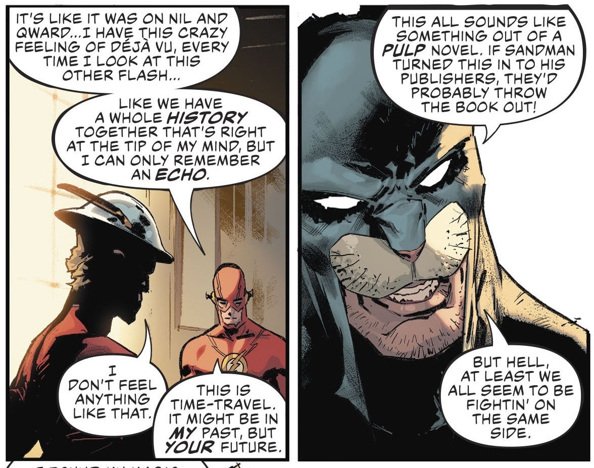 Justice League #31 has the Justice League travelling back in time to meet the Justice Society Of America, who they had never heard of. This is presumably because Dr Manhattan of Doomsday Clock had rewritten reality when creating the New 52 multiverse. And Flash meets Flash…