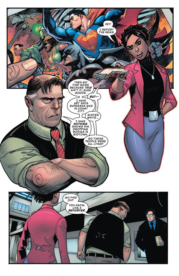 And it's that last page, complete with its recap page text forbidden previously by DC Comics but allowed for Bendis, that we are going to strip down for parts. Or Post-it-notes.
