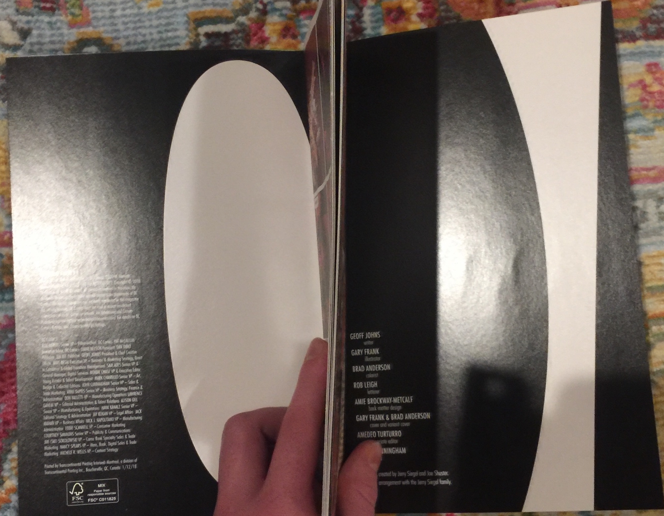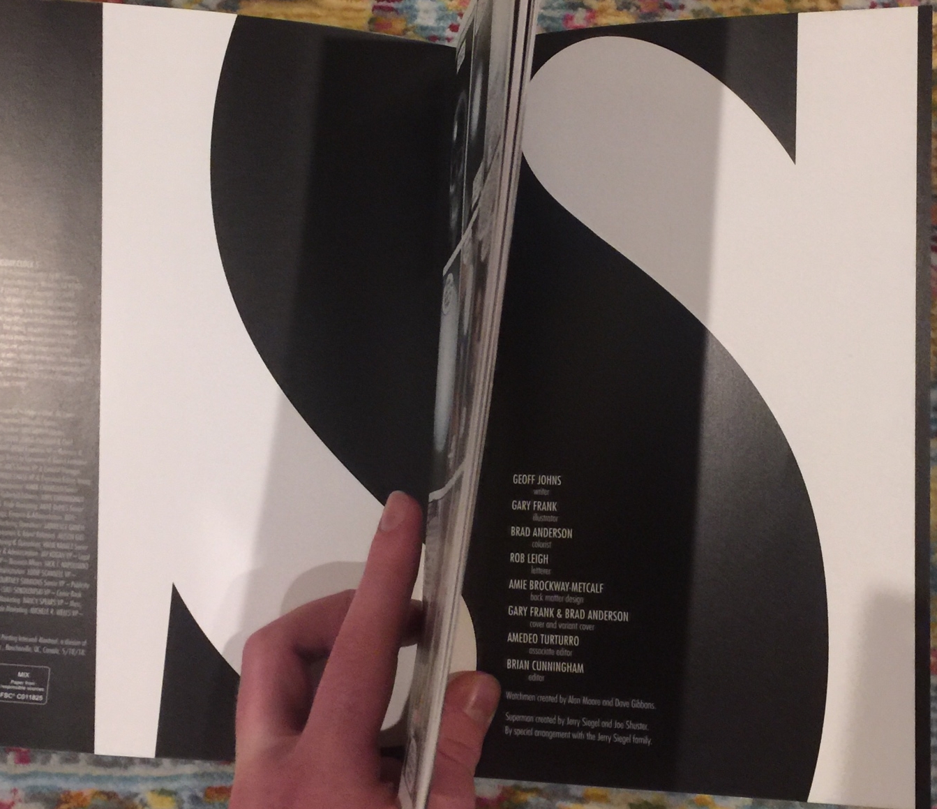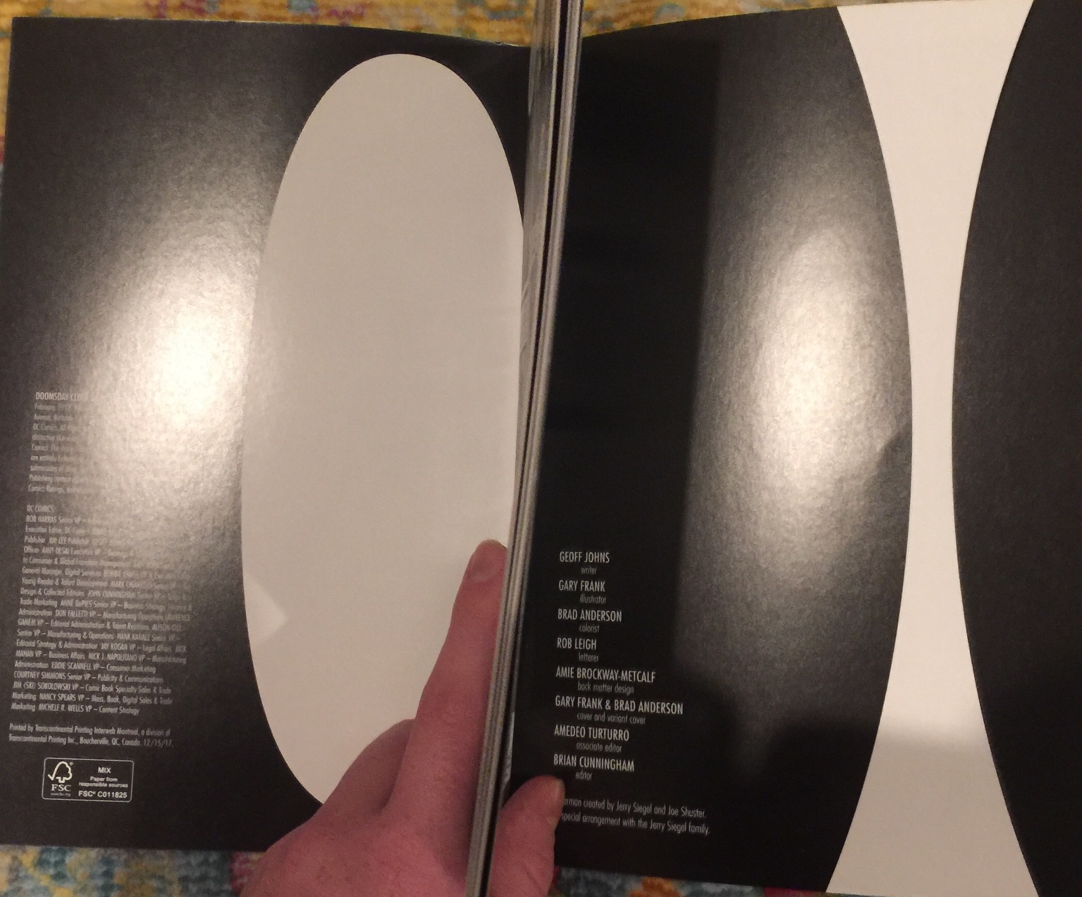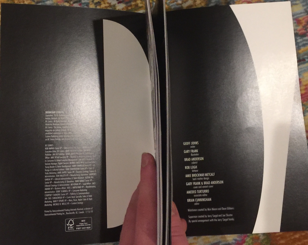 Doomsday Clock, the unauthorised sequel to Watchmen by Geoff Johns and Gary Frank, published by DC Comics has a very particular design sense inspired by the original Watchmen design. Such as no ads, no house ads, every page being part of the Doomsday Clock reading experience and narrative. Including the front pages and back pages. Each issue's frontispieces and endpieces, when positioned next to each other, create a letter of DOOMSDAY CLOCK in order.