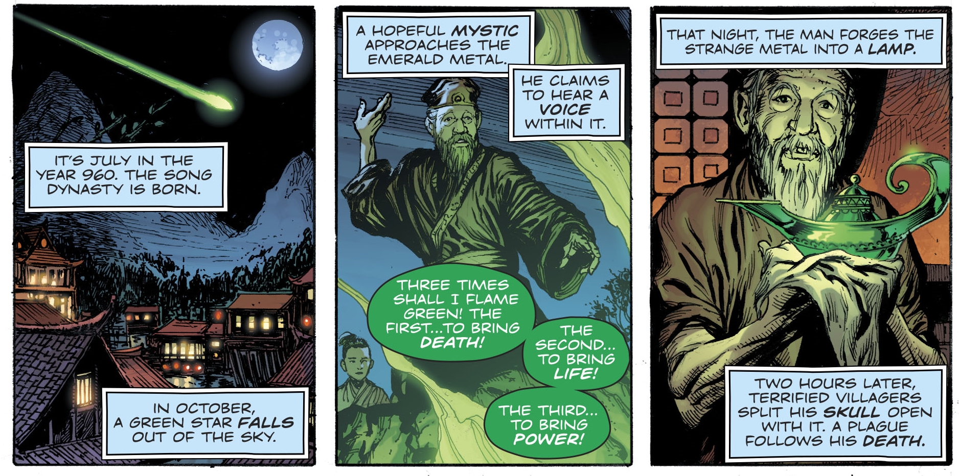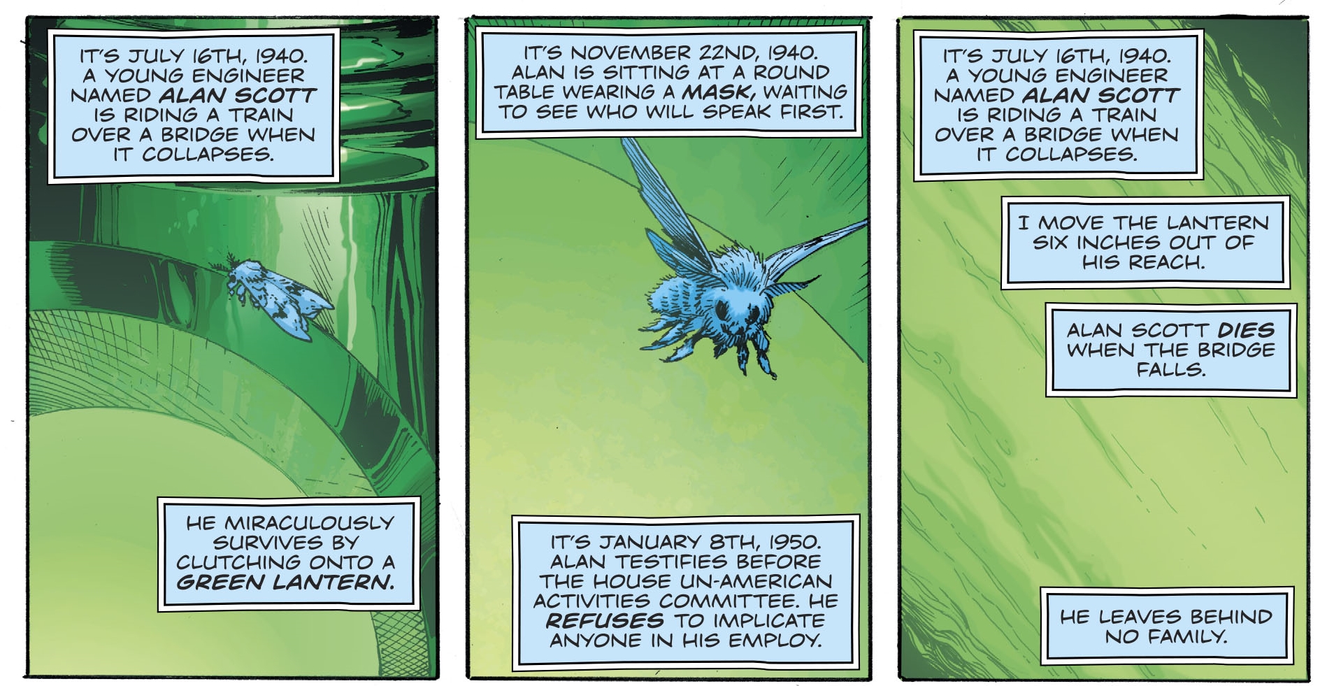 Alan Scott never becomes a magically-based Green Lantern. His continuity -including a Watchmen-like address to the house of un-American activities – is removed. And he is killed. His twins Obsidian and Jade, now no longer exist.